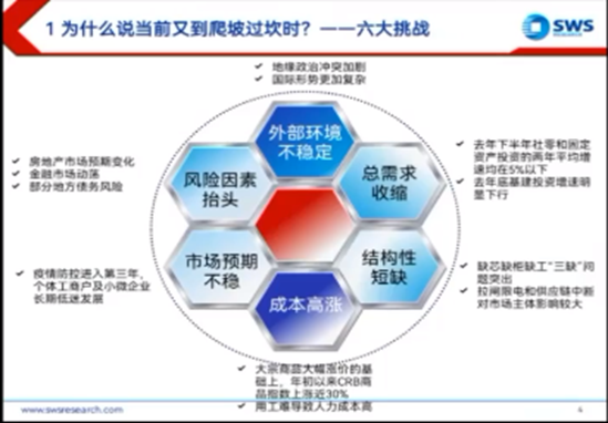 士首先闡述了當前又到了爬坡過坎期的三大原因:一是將今年預(yù)期增長目標定在了市場預(yù)期值的上限;二是市場普遍對2022年的經(jīng)濟增長較為擔憂;三是我國當前面臨的外部環(huán)境更加復(fù)雜嚴峻。在各種復(fù)雜環(huán)境下我國要實現(xiàn)平穩(wěn)增長不容易,經(jīng)濟發(fā)展進入“爬坡過坎期”。他表示,雖然今年國內(nèi)生產(chǎn)總值5.5%的增長率目標低于去年的8.1%,但是并不表明我國經(jīng)濟增長較弱。緊接著楊博士指出了我國經(jīng)濟發(fā)展的六大挑戰(zhàn):總需求收縮、結(jié)構(gòu)性短缺、成本高漲、市場預(yù)期不穩(wěn)、風險因素抬頭、外部環(huán)境不穩(wěn)定。