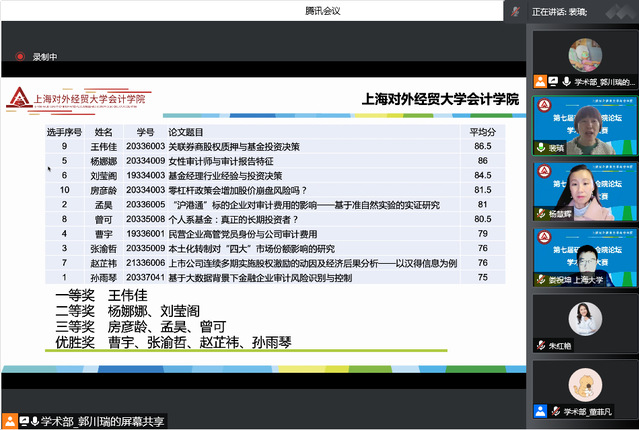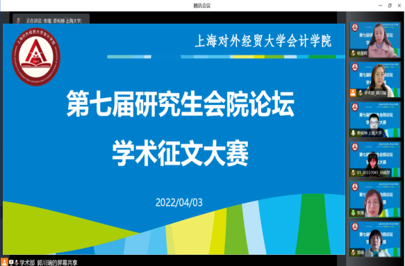 為培養研究生創新意識和學術思維,拓寬學術視野,強化學術規范,提升科研素養與學術創新能力,營造疫情下濃厚的學院研究生科研創新氛圍,4月3日下午,我院通過騰訊會議平臺舉辦了第七屆研究生會院論壇學術征文大賽決賽。大賽邀請了《財會月刊》執行主編張瑾女士、上海大學管理學院副教授婁祝坤擔任評委,會計學院院長裴瑱和副院長楊慧輝作為嘉賓出席了本次活動。
