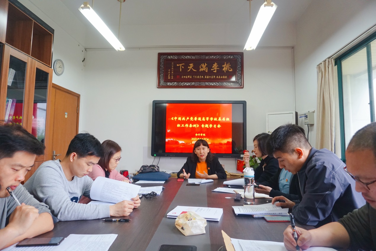 張嶸書記還結合《條例》梳理了學院黨委工作機制和基層黨支部的工作機制,強調教工黨支部依托會計系、審計系設置,支部書記和系主任要搭班工作,把支部的黨務工作與系的業務工作深度融合,在通力合作中激發更多的干事創業熱情。