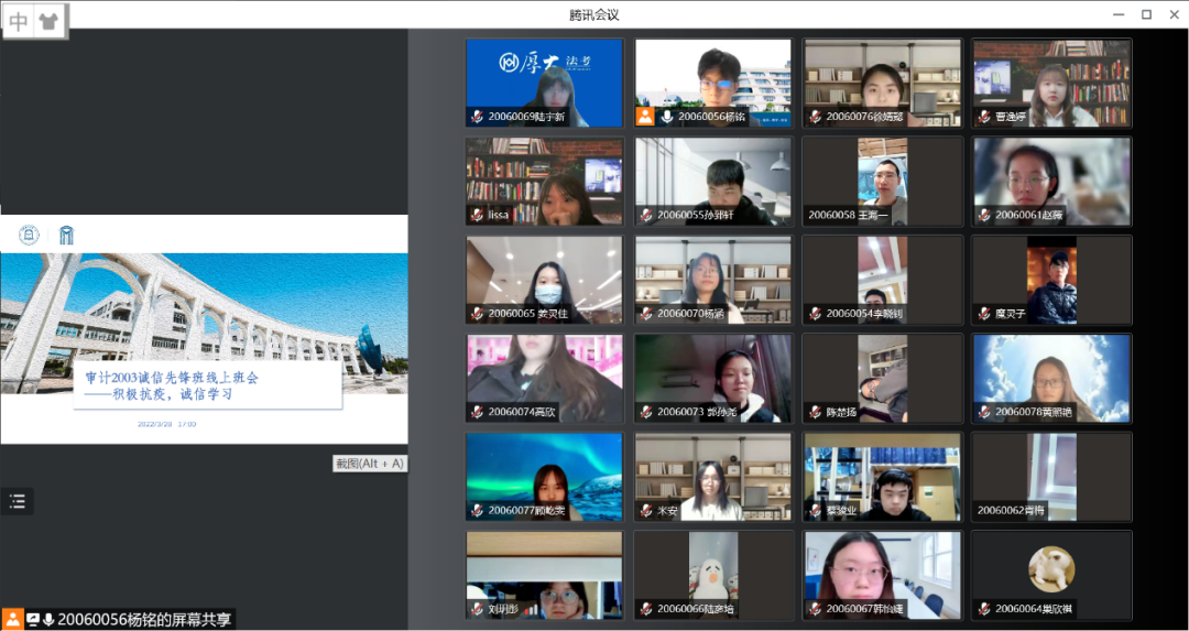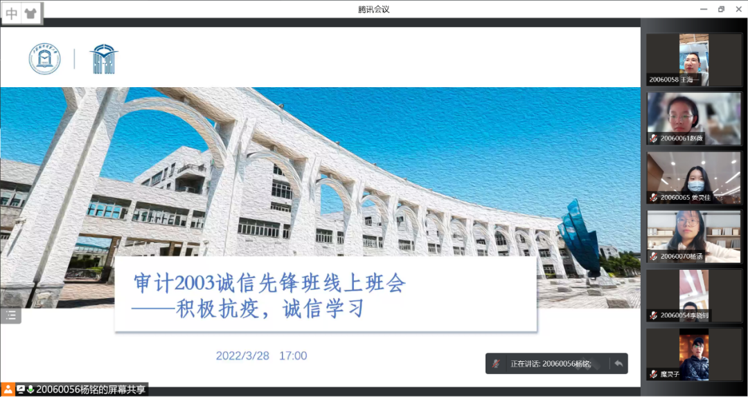 審計2003班級在線上開展了以“積極抗疫,誠信學習“為主題的先鋒班班會。在場同學都對抗疫和學習兩個主題進行了深度討論,通過誠信的內核為二者建立起初步的架構和橋梁;探討了疫情當下作為大學生該如何抗疫的初步設想。鼓勵同學們在保護好自己的同時,為社區的抗疫貢獻自己的一份力