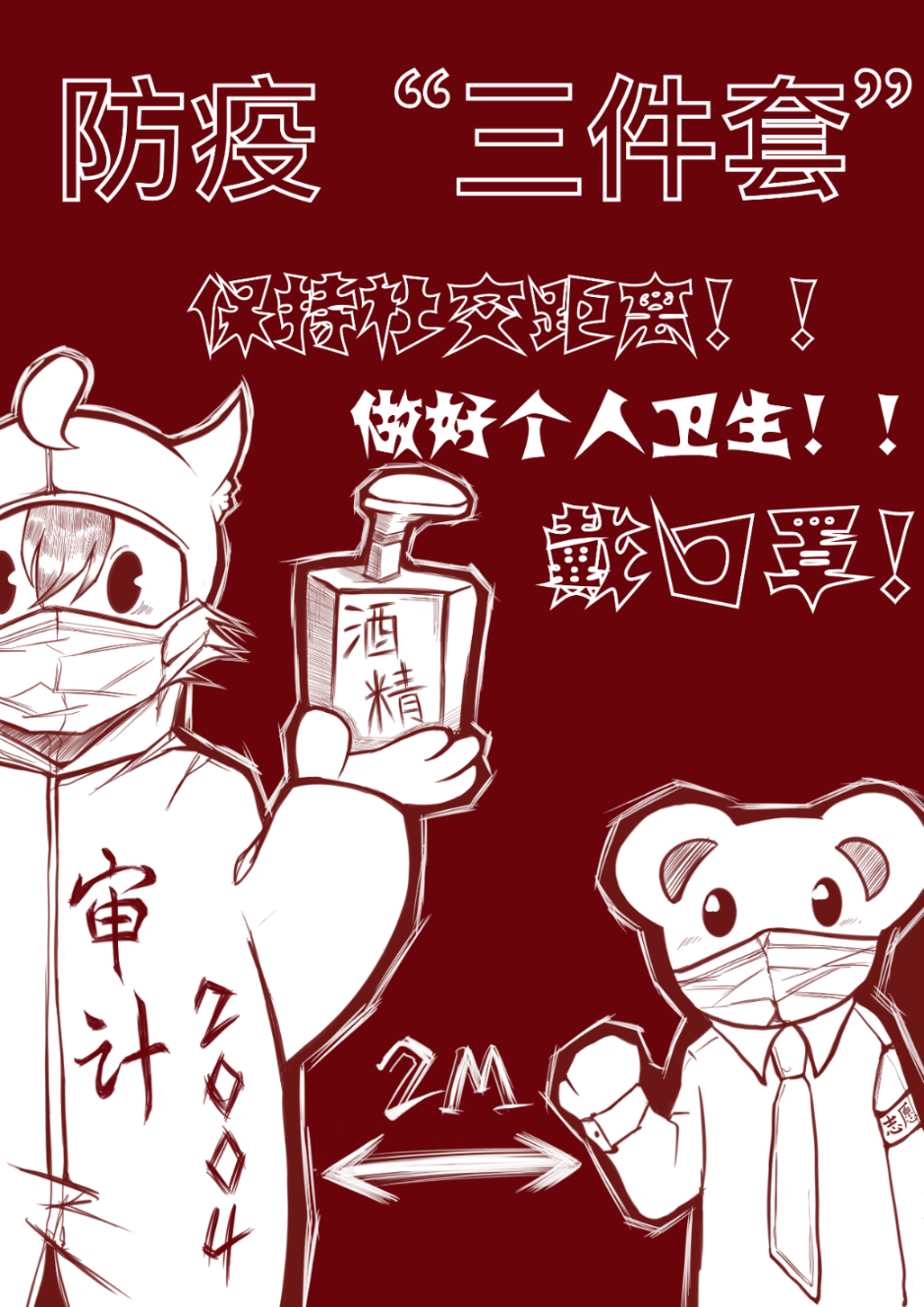 “貓”’鼠共協,戮力同心,“大白”貓象征著審計人員負責查賬的身份職責,在職業操守方面,要做到誠信守法,不偏不倚,公正執行;在防疫控制的特殊關鍵時期,堅守社區規范,保護好自己與身邊人;在個人品行方面,誠信是立身之本,行道之基。