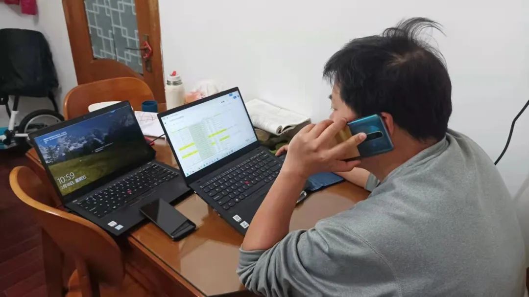 譚海楨老師居家隔離期間在線上展開工作,始終關心關愛著校區學生,制作表格,幾臺電腦手機同時運作,繁忙的電話消息背后是他的責任,更是關心。他明白,一切都是為了學生的安康,一切都是為了更美好的明天。
