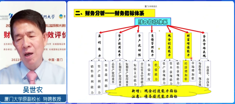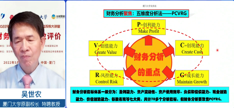 基于案例分析,吳教授總結了財務分析的重點,指出財務分析與財務績效評價需要聚焦分析指標體系,要著重從公司創利、創值、創現、風控以及成長能力展開財務分析。