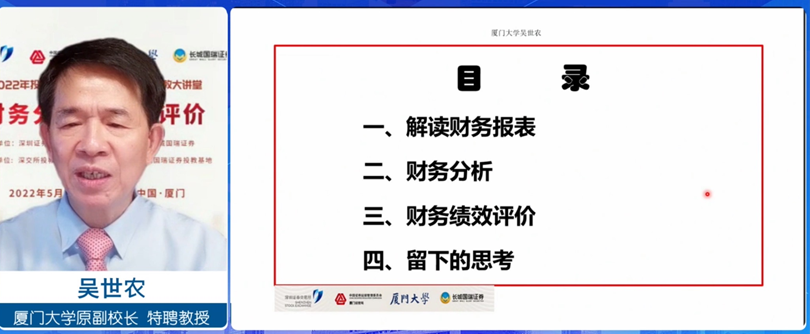 5月6日下午,學院數百名MPAcc研究生在線聆聽了主題為“財務分析與績效評價”的學術講座。本次講座由廈門大學副校長、博士研究生導師、國家自然科學基金委員會委員、國務院學科評議組成員、全國工商管理碩士(MBA)指導委員會副主任、教育部管理學部學部委員吳世農教授講授。
