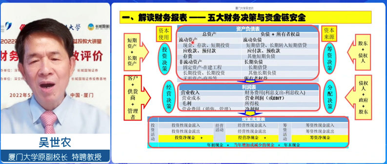 講座伊始,吳世農教授從企業、投資者、監管部門、中介這四個角度闡述了公司管理中的三大戰略及其二大財務目標,指出企業財務管理內部目標的重要性;接下來,吳教授引入資產負債表、利潤表以及現金流量表,細致解讀了三大報表的基本架構及其要素內涵,進一步分析資本、資產、收入、利潤以及現金之間的關系。吳教授提出“現金為王,經營活動凈現金為王中王”的觀點,指出企業經營活動凈現金一定要比凈利潤大,從而保障企業資金鏈安全,實現企業價值最大化。
