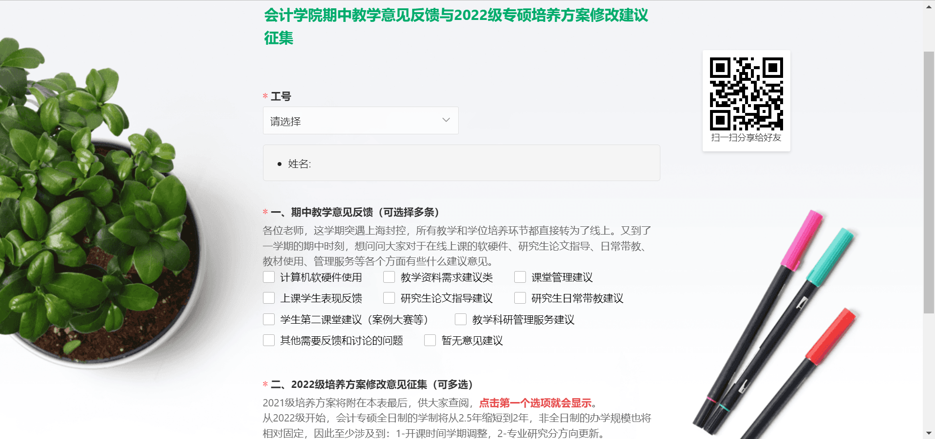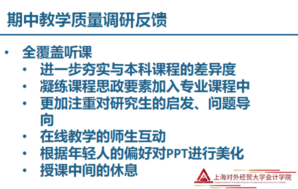 通過“期中教學意見反饋”在線問卷平臺,真誠邀請每一位教師進行諫言征求意見,匯集全員智慧凝聚力量做好教書育人工作。學院教師積極建言,問卷共收到針對學院研究生課程教學、學位點建設、教研和科研工作、研究生學業和就業指導、研究生學位論文質量控制、師德師風建設、學風建設以及教學保障措施等各方面意見和建議三十多條,會計學院將認真總結、歸納、梳理老師們的意見,并及時做好相應的改進、優化工作,把學院研究生教學水平提升和培養質量提高落到實處。
