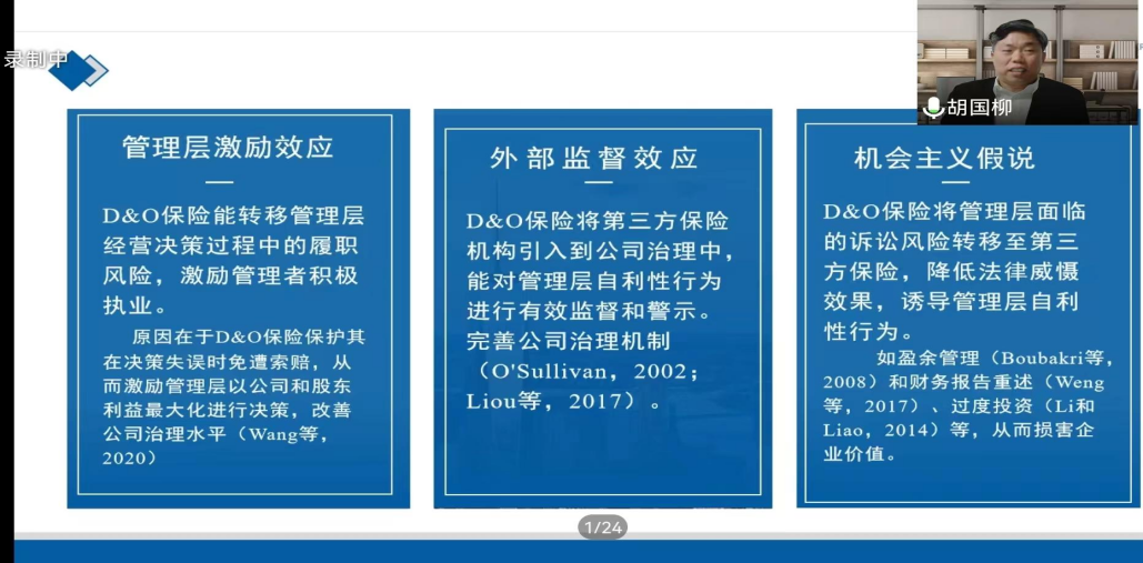 5月13日晚,學(xué)院全體研究生通過云端聆聽了由浙江工商大學(xué)會計(jì)學(xué)院院長胡國柳教授帶來的主題為“董事高管責(zé)任保險(xiǎn):理論研究與中國實(shí)踐”的精彩的學(xué)術(shù)報(bào)告。胡國柳教授為財(cái)政部“會計(jì)名家培養(yǎng)工程”入選者,“百千萬人才工程”國家級人選、國家“有突出貢獻(xiàn)中青年專家”、享受“國務(wù)院政府殊津貼”專家、教育部“新世紀(jì)優(yōu)秀人才支持計(jì)劃”入選者、“寶鋼優(yōu)秀教師獎(jiǎng)”獲得者。擔(dān)任教育部高等學(xué)校工商管理類專業(yè)教學(xué)指導(dǎo)委員會會計(jì)學(xué)專業(yè)教學(xué)指導(dǎo)分委員會委員、中國會計(jì)學(xué)會財(cái)務(wù)管理專業(yè)委員會會員。