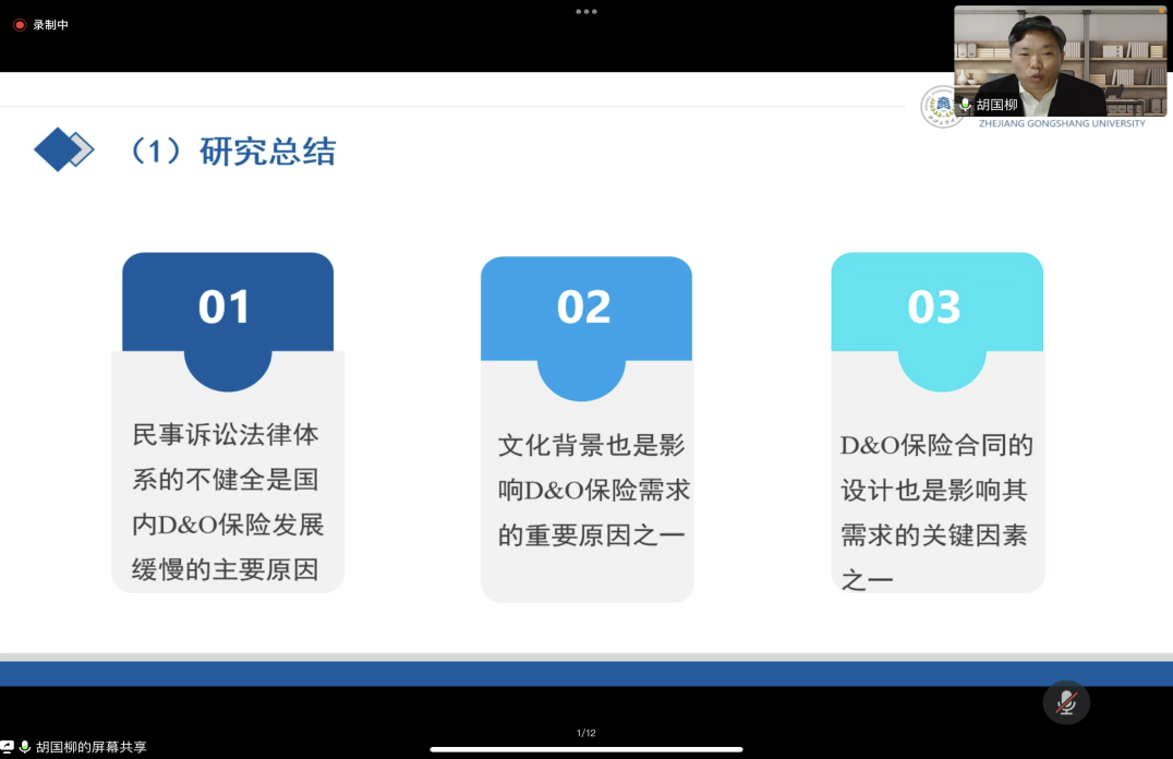 于案例分析,胡教授進(jìn)行了總結(jié)與展望,他表示民事訴訟法律體系的不健全是國內(nèi)D&O保險(xiǎn)發(fā)展緩慢的主要原因,文化背景也是影響D&O保險(xiǎn)需求的重要原因之一,D&O保險(xiǎn)合同的設(shè)計(jì)是影響其需求的關(guān)鍵因素。同時(shí),胡教授認(rèn)為D&O保險(xiǎn)在需求動因、治理效應(yīng)、合同內(nèi)容設(shè)計(jì)、訴訟與賠付案例等方面的研究相對不足,D&O保險(xiǎn)在中國的認(rèn)購率較低,未來仍有很大研究空間。