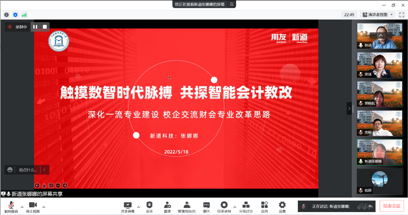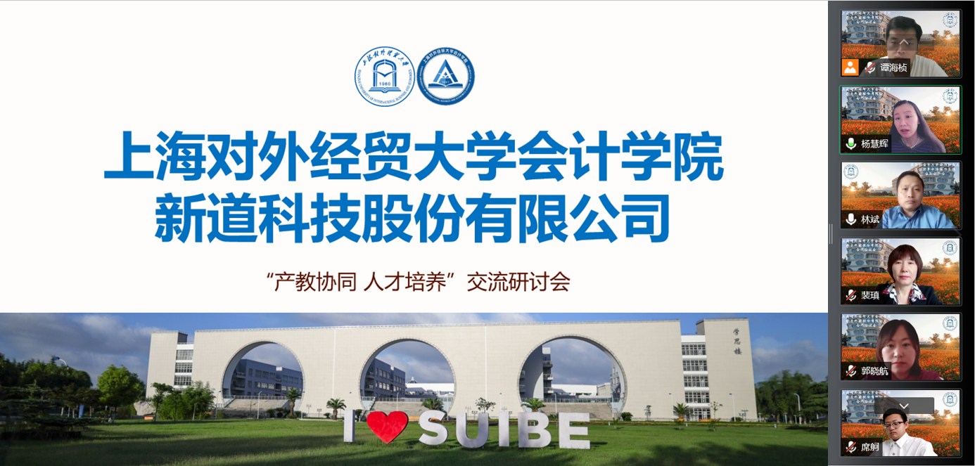 為貫徹落實黨中央、國務院關于高校畢業生就業工作的決策部署,落實教育部關于全國高校書記、校長訪企拓崗促就業專項行動,落實學校關于開展院長、書記訪企拓崗促就業專項行動的通知,深入落實學院就業工作“一把手”工程;同時,按照財政部《會計改革與發展“十四五”規劃綱要》做好人才培養共工作。會計學院于5月18日,邀請新道科技有限進行了在線洽談,雙方就深化產教融合、做好財會課程改革、協助教師科研實訓、推動學生就業展開商討。新道科技股份有限公司上海區總經理林斌、江南區副總經理錢麗、新道北京總部商科專家張娜娜、上海校企合作經理郭曉航、教學顧問劉玉、售前顧問席舸,會計學院院長裴瑱教授、副院長楊慧輝教授、MPAcc中心副主任/輔導員譚海楨出席了本次合作洽談會。