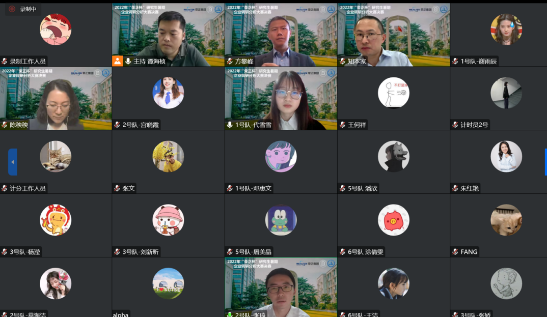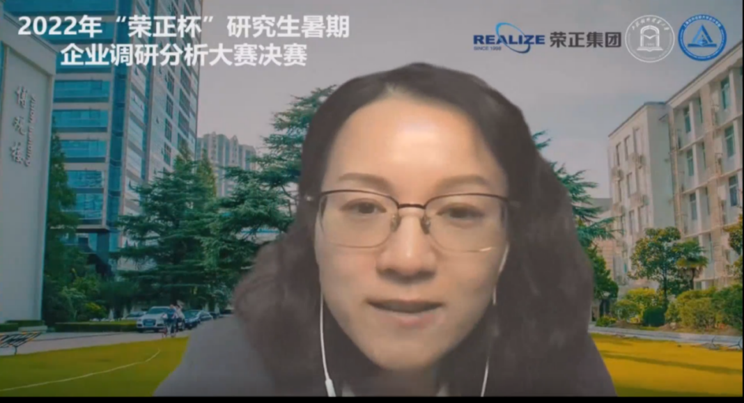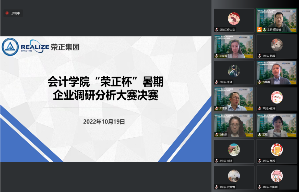 為發(fā)揮實(shí)踐育人和科研育人在研究生創(chuàng)新人才培養(yǎng)中的積極作用,培養(yǎng)和增強(qiáng)研究生的創(chuàng)新意識(shí)以及發(fā)現(xiàn)、分析、解決企業(yè)實(shí)際問題的應(yīng)用創(chuàng)新能力和實(shí)踐能力,會(huì)計(jì)學(xué)院舉辦研究生暑期企業(yè)調(diào)研分析大賽;學(xué)院產(chǎn)學(xué)研基地——上海榮正企業(yè)咨詢服務(wù)(集團(tuán))股份有限公司贊助冠名。此次大賽是學(xué)院強(qiáng)化深度產(chǎn)教融合協(xié)同育人的一個(gè)重要舉措,為研究生提供了學(xué)術(shù)交流、學(xué)以致用、服務(wù)社會(huì)的實(shí)踐平臺(tái)。大賽決賽于10月19日在騰訊會(huì)議云端精彩呈現(xiàn)。榮正集團(tuán)董事長(zhǎng)兼首席合伙人鄭培敏先生、榮正集團(tuán)常務(wù)副總經(jīng)理兼資深合伙人方攀峰先生和學(xué)術(shù)專家評(píng)委華東政法大學(xué)MPAcc中心主任陳秧秧副教授出席并擔(dān)任評(píng)委,學(xué)院院長(zhǎng)裴瑱教授、副院長(zhǎng)楊慧輝教授、各支參賽隊(duì)伍及指導(dǎo)老師參加本場(chǎng)決賽。決賽由MPAcc教育中心副主任譚海楨主持。