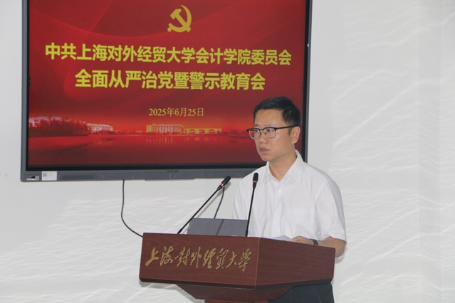 6月25日下午,會計學院在松江校區黨建服務中心召開全面從嚴治黨暨警示教育會,深入學習貫徹習近平總書記關于加強黨的作風建設的重要論述和中央八項規定及其實施細則精神,通報上級關于全面從嚴治黨的工作要求,總結回顧學院全面從嚴治黨工作,分析研判形勢任務,開展警示教育,部署下一階段工作要求。學院黨政班子成員及全體教職工參加會議。會議由學院黨委書記歐陽君主持。