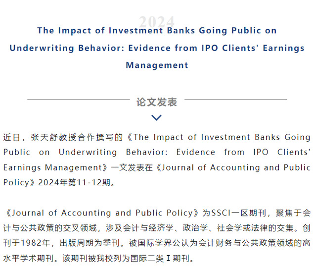 學(xué)術(shù)前沿|我校張?zhí)焓娼淌诤献髯珜懙恼撐脑贘ournal of Accounting and Public Policy發(fā)表