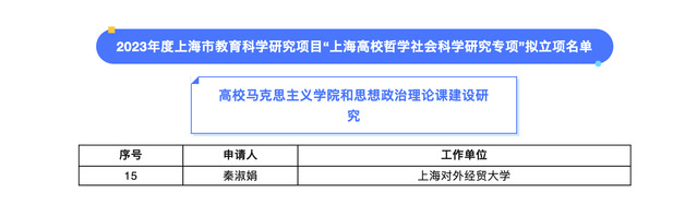 近日,2023年度上海市教育科學研究項目“上海高校哲學社會科學研究專項”立項名單公布,我院教師秦淑娟獲