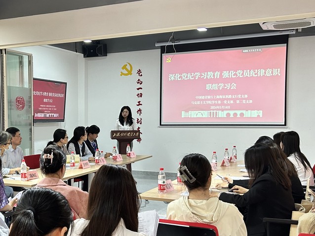 為扎實(shí)開展黨紀(jì)學(xué)習(xí)教育,強(qiáng)化黨員的紀(jì)律意識,提升黨員的政治素養(yǎng),5月14日下午,上海對外經(jīng)貿(mào)大學(xué)馬克思主義學(xué)院學(xué)生第一黨支部、學(xué)生第二黨支部與中國建設(shè)銀行上海梅家浜路支行黨支部聯(lián)合開展“深化黨紀(jì)學(xué)習(xí)教育,強(qiáng)化黨員紀(jì)律意識”聯(lián)組學(xué)習(xí)會。中國建設(shè)銀行松江支行黨委委員周瑋、中國建設(shè)銀行松江支行紀(jì)檢組黨支部書記須偉明以及三個支部的黨員參加會議,會議由馬克思主義學(xué)院第一黨支部紀(jì)檢委員王馨瑋主持。