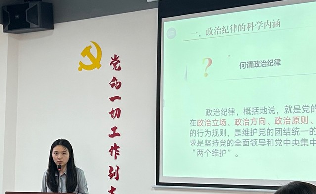 馬克思主義學(xué)院學(xué)生第一黨支部書記胡婷以“堅(jiān)定政治信念 守牢紀(jì)律防線”為題作政治紀(jì)律專題黨課,她結(jié)合新修訂的紀(jì)律處分條例,深刻闡述“政治紀(jì)律是最重要、最根本、最關(guān)鍵的紀(jì)律,遵守黨的政治紀(jì)律是遵守黨的全部紀(jì)律的重要基礎(chǔ)”,強(qiáng)調(diào)全體黨員要時刻緊繃政治紀(jì)律這根弦,自覺將政治紀(jì)律要求內(nèi)化于心、外化于行。