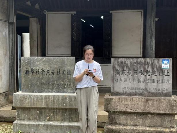 在新華社浙東分社《新浙東報》社舊址,研究生黨員周銀俐講授“抗日戰爭與黨的宣傳工作”微黨課,講解了浙東韜奮書店的創辦始末和歷史意義。浙東抗日根據地韜奮書店的報刊新聞出版和宣傳工作,是我國抗戰時期新聞事業的重要組成部分。這些書刊的發行,在極其艱苦的戰斗歲月中傳達了黨中央的聲音,徹底粉碎了敵人的新聞封鎖,為堅持浙東抗戰、凝聚浙東民眾人心起到很好作用,成為浙東根據地軍民的“精神家園”,為宣傳黨的抗日民族統一戰線方針政策,鼓舞和指導浙東地區的抗日戰爭勝利做出了重要的貢獻。