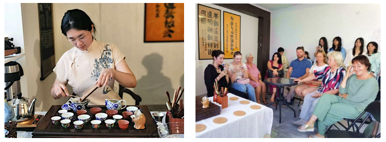 為傳遞東方茶道之美,團隊成員莊巖身著典雅旗袍,開啟了一場沉浸式的茶藝之旅。她首先介紹了茶席上的“伙伴”——各式茶具及其功用,隨后清晰講解紅茶、綠茶、烏龍茶、黑茶的不同韻味。伴隨著行云流水般的動作,莊巖完整示范了從“請茶”“洗茶”,到“泡茶”“拂蓋”,再到“分杯”“奉茶”,最后到“聞香”“品茗”的完整茶藝流程。縷縷茶香在異國的閣樓書齋間裊裊升起,一盞清茗在西方賓客的舌尖緩緩舒展,東方茶文化的寧靜致遠與和諧包容,悄然浸潤在場觀眾的心田。