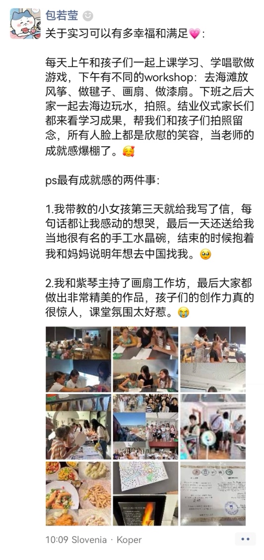在本次科佩爾孔子課堂的海外實習中,上海對外經貿大學的學子們以語言為舟,以文化為帆。他們不僅夯實了國際中文教育的專業能力,更在亞得里亞海畔播下了友誼與理解的種子。孩子們學說“早上好”時的認真,揮舞彩繪團扇時的自信,齊唱中文歌時的快樂,都是這段旅程最珍貴的回響。當中國風拂過斯洛文尼亞的海岸,這群年輕的“文化使者”正以實際行動詮釋著文明互鑒的深遠意義,為共建“一帶一路”民心相通之路,書寫下獨具一格的動人青春腳注。