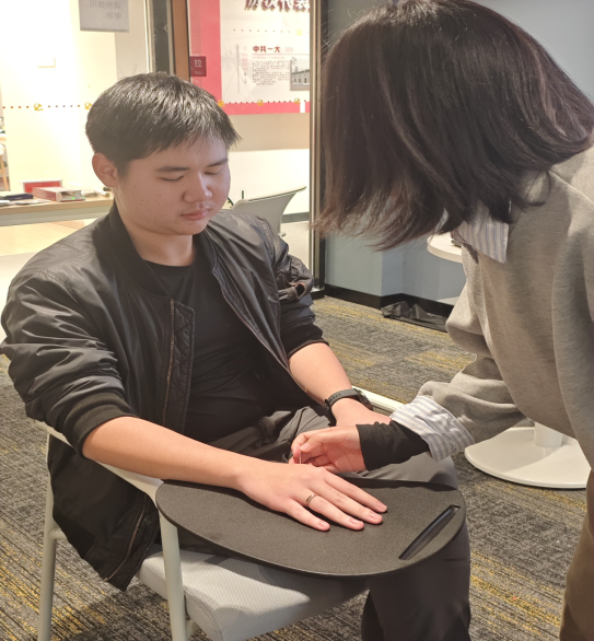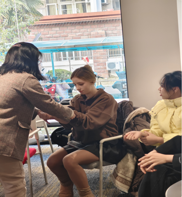 接下來老師帶領(lǐng)留學(xué)生開展了充滿傳統(tǒng)氣息的中醫(yī)體驗。體檢區(qū)擺滿了中醫(yī)草藥和輔助工具。在老師的引導(dǎo)下,留學(xué)生先是聞中草藥的獨特香氣,接著品嘗了中藥保健食品。隨后,老師示范了推拿手法,同學(xué)們結(jié)對互相實踐,通過推拿放松肌肉。最后,大家親身體驗了中醫(yī)傳統(tǒng)療法——針灸的魅力,學(xué)習(xí)了如何通過正確刺激穴位讓自己放松和舒緩。