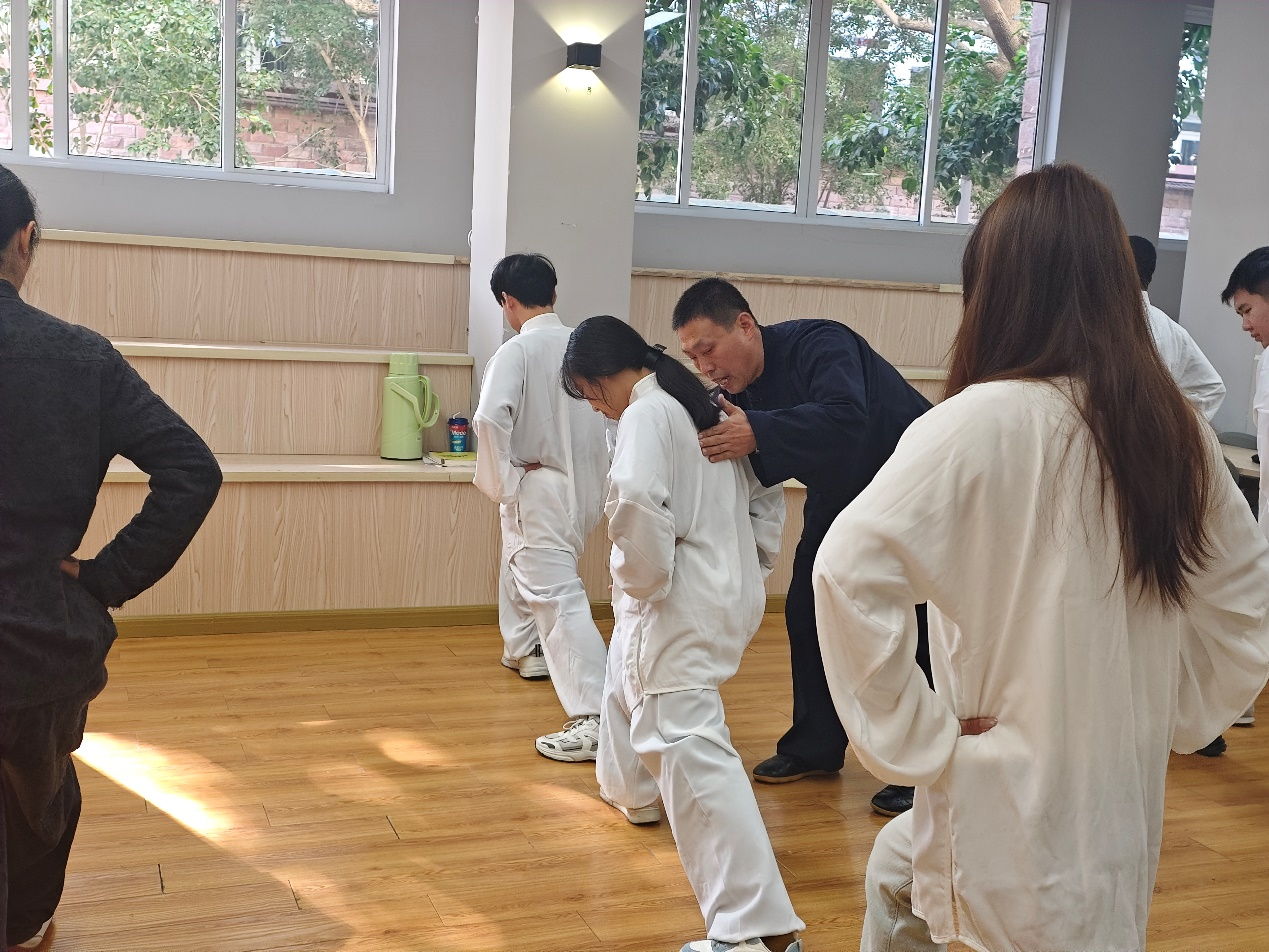 在武當(dāng)太極拳的練習(xí)過(guò)程中,熊老師為學(xué)生們講解太極拳的基本動(dòng)作要領(lǐng)和呼吸方法,先帶學(xué)生們學(xué)了熱身操,然后帶大家學(xué)習(xí)了太極云手,特別強(qiáng)調(diào)了云手里蘊(yùn)含的中國(guó)哲學(xué)內(nèi)涵:陰陽(yáng)平衡、物極必反、合久必分分久必合,通過(guò)這樣的事物發(fā)展規(guī)律也可以對(duì)大家的學(xué)習(xí)生活進(jìn)行指導(dǎo),當(dāng)學(xué)習(xí)遇到瓶頸可以轉(zhuǎn)換思維和心態(tài),以豁達(dá)的心態(tài)去迎接挑戰(zhàn)、面對(duì)困難。