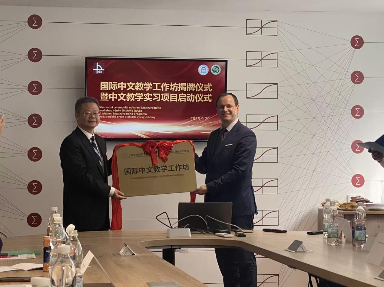 捷克時間9月29日上午,國際中文教育工作坊揭牌儀式暨中文教學實習項目啟動儀式在捷克布杰約維采商業技術學院隆重舉行。校黨委副書記、紀委書記章益國一行,捷克布杰約維采商業技術學院校領導團隊,孔子課堂中方負責人郝文鈞,國際中文教育學院2025年捷克海外實習團隊全體師生共同出席儀式。儀式由國際中文教育學院2025屆畢業生、孔子課堂志愿者周梓騰,當地大提琴家瓦茲拉夫共同主持。