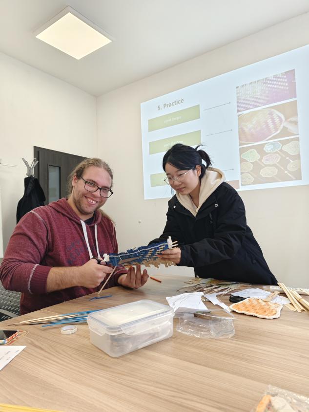 羅飄首先圍繞“竹”展開教學,先帶領學生掌握“竹子”“竹扇”“竹條”等基礎詞匯。課堂上,她結合手中的竹條、竹扇實物,用簡潔通俗的漢語搭配形象的肢體動作,向學生科普竹編相關知識,著重強調“竹編是珍貴的中國傳統手藝”。在后續的實踐操作環節中,她為學生分發竹條,手把手指導竹扇編制,成功實現語言學習與手工體驗的深度融合。