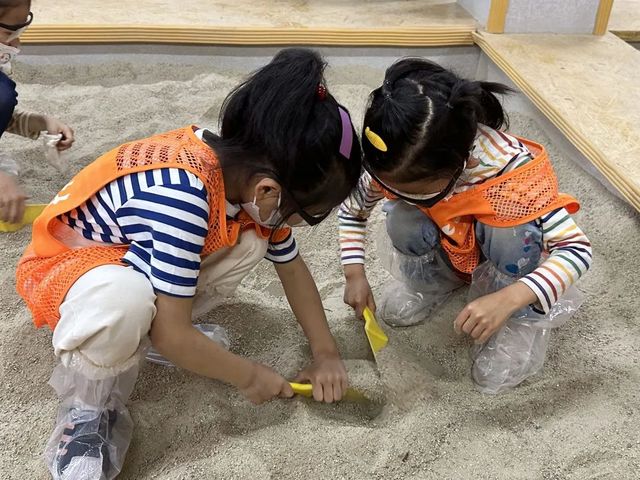 學(xué)完了考古工具,孩子們在考古老師的指導(dǎo)下使用專業(yè)挖掘工具,自己進(jìn)行考古體驗(yàn),挖掘自己的專屬“文物”。挖掘之后,進(jìn)行測量、登記、存放。