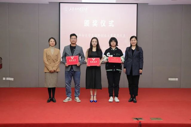 學研工部部長、武裝部部長、學生處處長繆韻笛,招生就業處處長魏舒為2022年女大學生創新創業大賽獲獎選手頒獎。