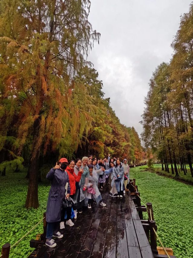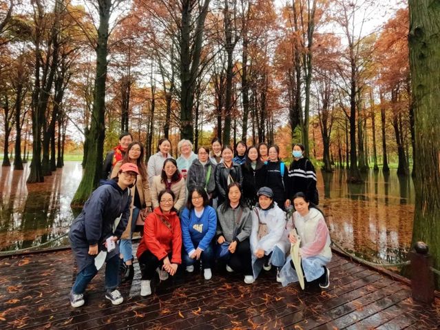 秋風不語、落葉無聲,青西郊野公園是一個以濕地為特色的郊野公園,其中以遍布水上水杉而出名。十一月末、十二月初,這里的水杉由綠變紅,形成一道獨特的風景線。游覽過程中,女教師們結伴而行,相談甚歡,彼此合影留念,記錄下這樣的美景與歡樂時刻。