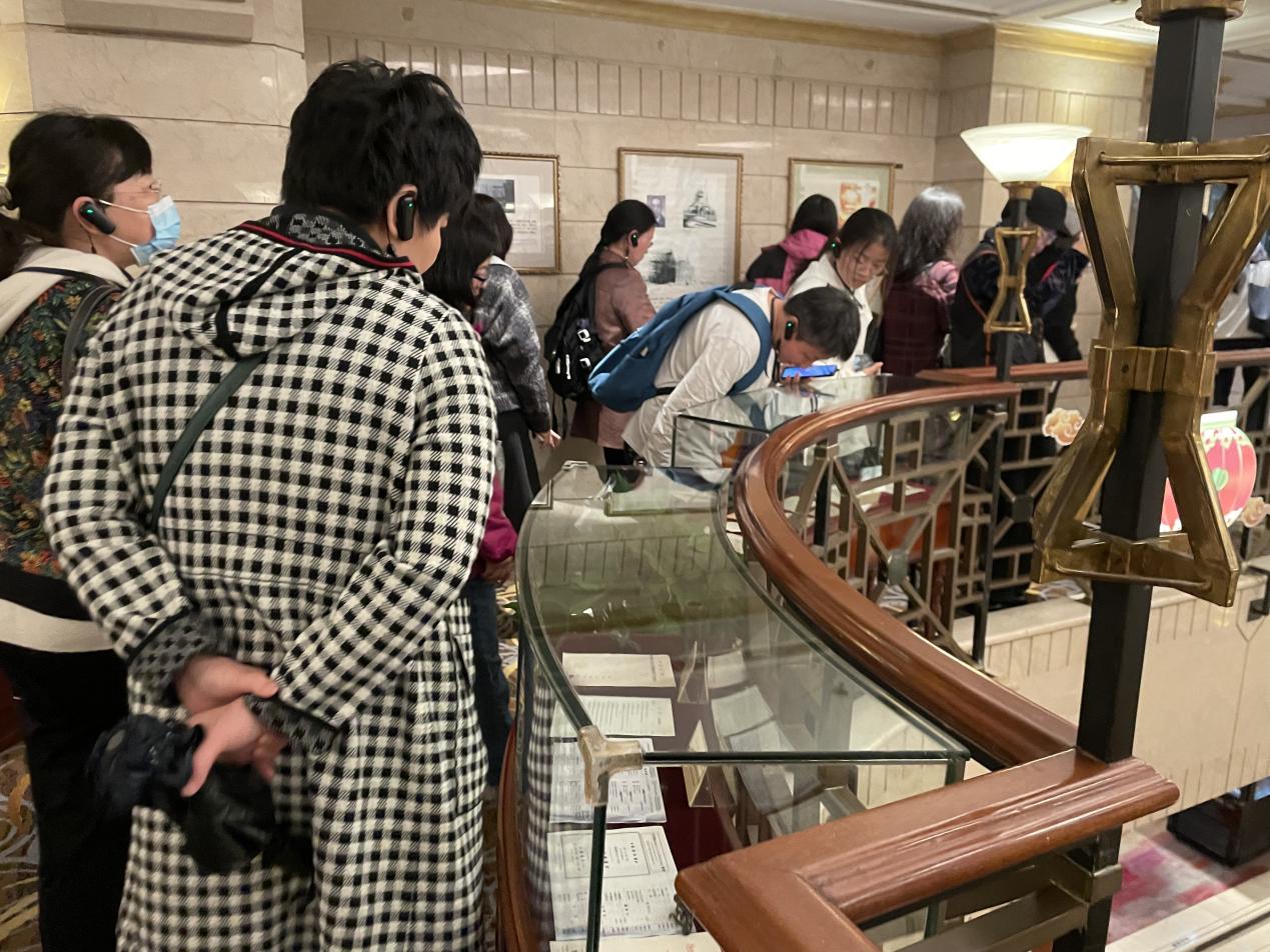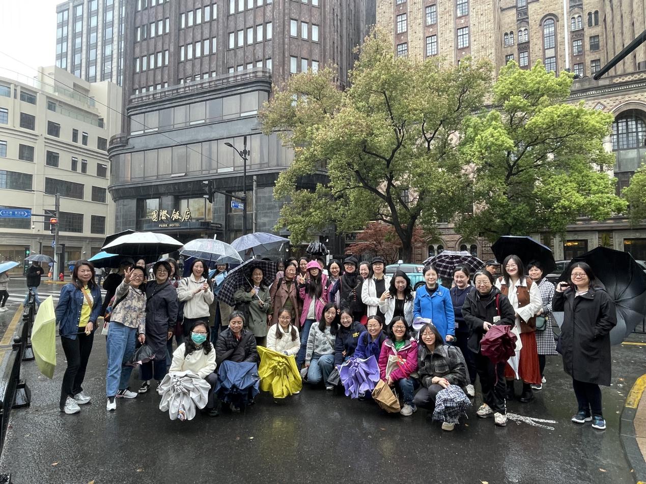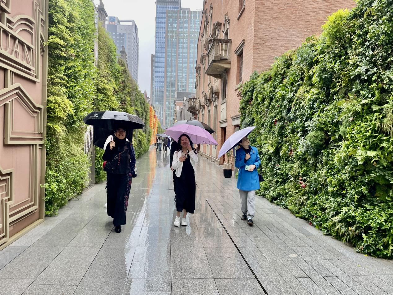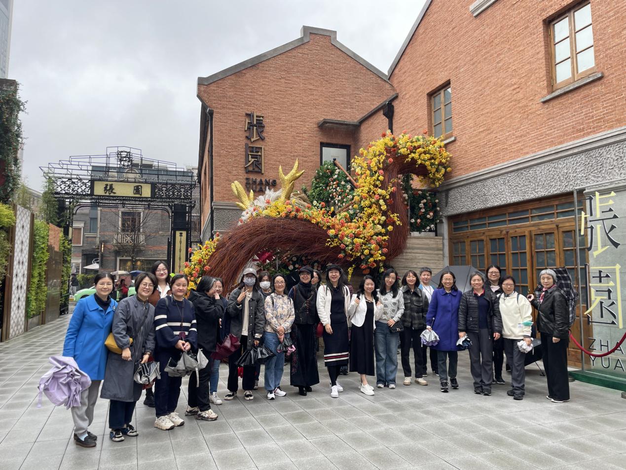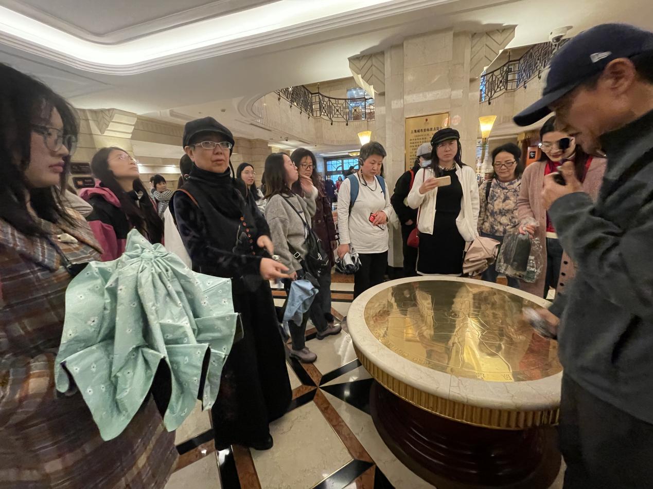在導游的講解和帶領下,上午大家以國際飯店為起點,打卡了黃河路苔圣園、大光明影院、體育大廈、金門大酒店等“阿寶、爺叔、汪小姐”待過的地方,感受歷史老建筑帶來的滄桑感和文化底蘊。午后,來到建造于1882年的張園,它由170幢不同風格的里弄建筑組成,是上海現存規模最大、保存最完整、建筑風格最豐富的石庫門建筑群,堪稱活著的“石庫門博物館”。當天雖然小雨淅瀝,老師們還是饒有興致的駐足觀賞、拍照留念。