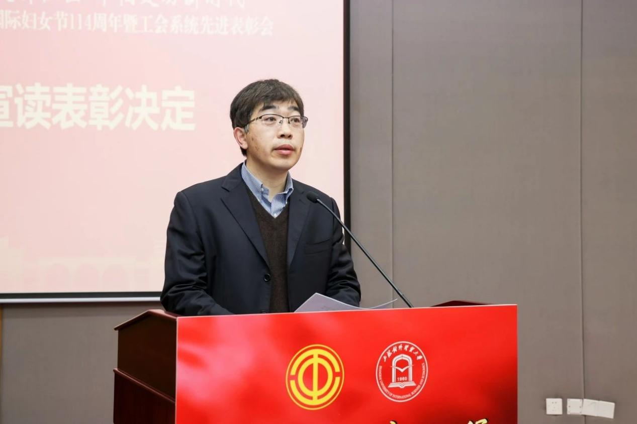3月8日上午,學(xué)校紀(jì)念“三八”國際婦女節(jié)114周年暨工會(huì)系統(tǒng)先進(jìn)表彰會(huì)在松江校區(qū)圖文信息樓526舉行。校黨委副書記、校工會(huì)主席吳毅出席會(huì)議并致辭,校工會(huì)委員、經(jīng)審委員、女工委員、各二級(jí)工會(huì)主席(委員)、先進(jìn)集體和個(gè)人獲獎(jiǎng)代表等60余人出席會(huì)議。會(huì)議由校婦工委副主任、工會(huì)女工委副主任居怡主持。
