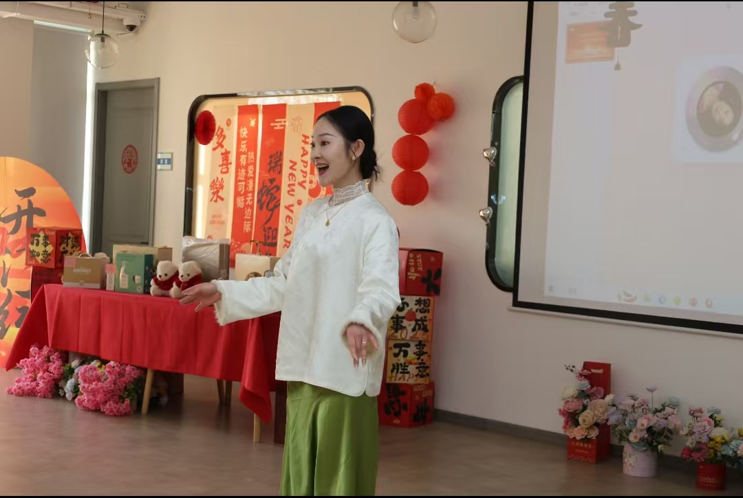 抽獎環節更是將現場氣氛推向了高潮。老師們紛紛上臺參與套圈抽獎,幸運兒們獲得了精美的獎品。此外,傳統小游戲“擊鼓傳花”也為現場增添了不少樂趣,鼓聲停下來時,手握幸運小熊的老師為大家表演了小節目,整個現場洋溢著歡樂與祥和的氛圍。
