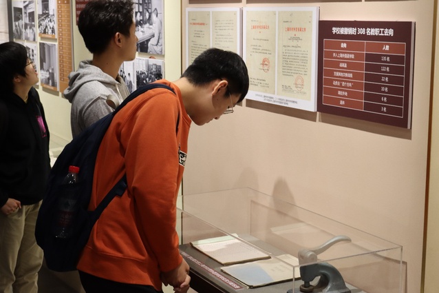校史館陳列以時間為主軸,以重大歷史事件和人物為重點,講述了學校兩落三起的悠久歷史。在居怡的精彩講解下,一件件舊物件、一張張老照片、一代代貿大人帶著大家徜徉在學校60年的歷史長河中,置身于那個年代那個場景,仿佛能真切地參與著、演繹著那個時代的故事。