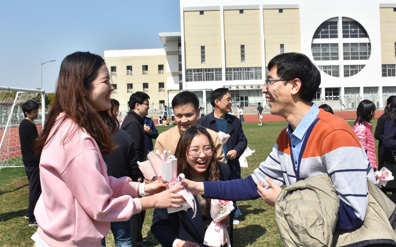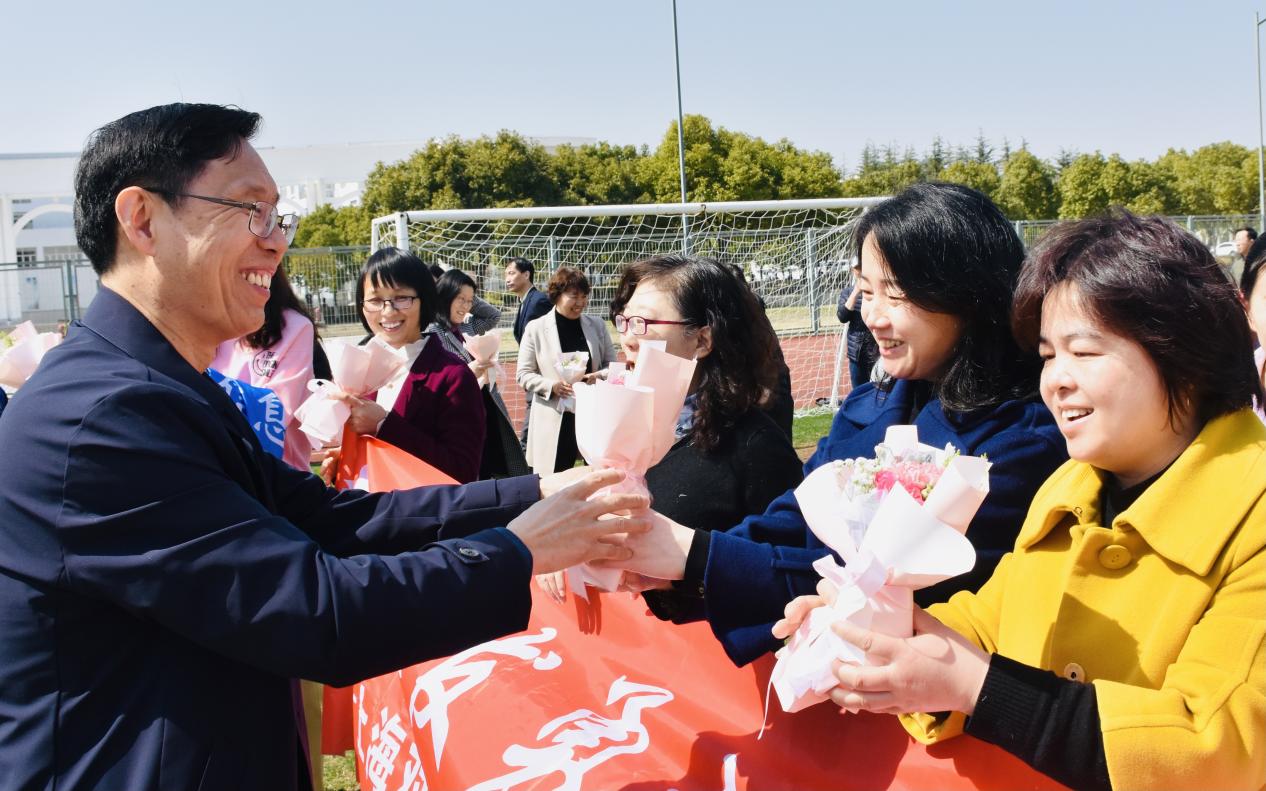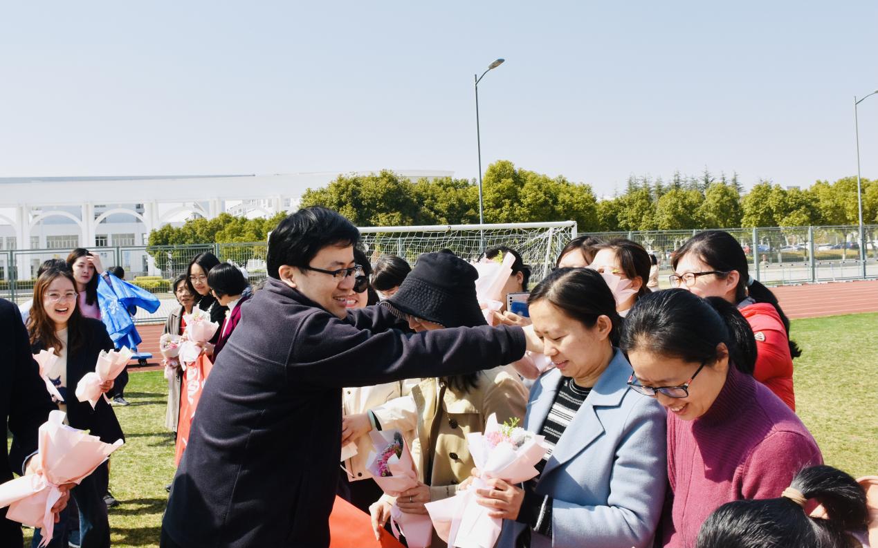 作為校園漫步訪春的終點,老師們紛紛匯聚到了學校操場。男性教師熱情地為每位女老師獻上了一束鮮花,祝福她們節日快樂。最后,大家一起大聲呼喚活動的主題——“踔厲奮發勇擔當,凝心聚力綻芳華”,在熱烈向上的氛圍中,活動圓滿結束。