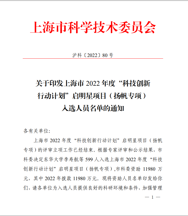 “科技創新行動計劃”啟明星項目(揚帆專項) 原名“揚帆計劃”,是上海市科委為推進實施創新驅動發展戰略,加快建設具有全球影響力的科技創新中心,加強上海科技人才隊伍建設,培育優秀青年科技人才而設立的科技創新人才培育計劃,主要面向在滬高校和科研院所等單位32周歲以下的在崗科研人員,旨在選拔和培養一批嶄露頭角的優秀青年科技人才,鼓勵其進行原始創新和大膽探索,盡快成長為上海科技創新的中堅力量。