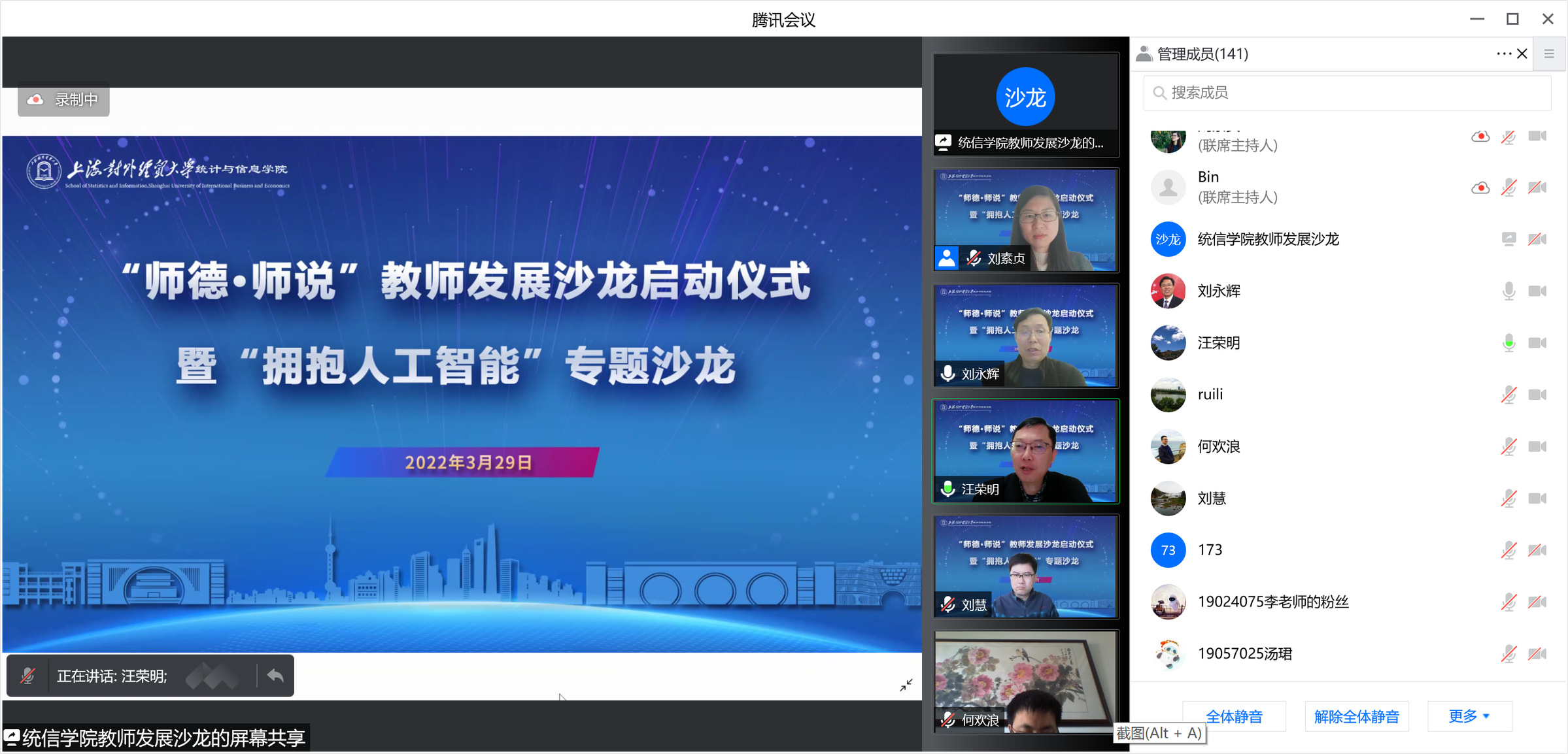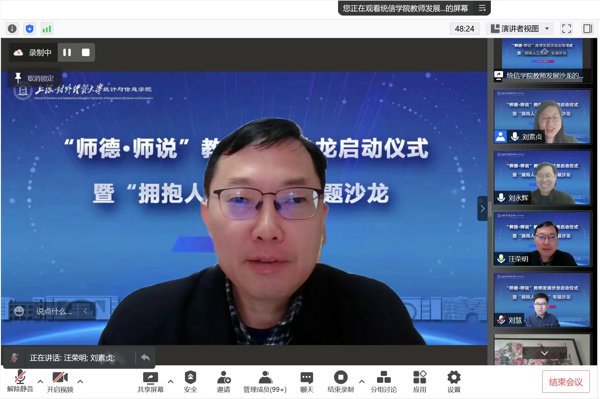 為進一步加強學院新時代師德師風建設,構建教師發展共同體,3月29日下午,統計與信息學院“師德·師說”教師發展沙龍啟動儀式暨首場專題沙龍在線舉行,校長汪榮明出席并講話。校科研處處長何歡浪,統計與信息學院領導班子、學院師生150余人參加活動,活動由統計與信息學院院長劉永輝主持。