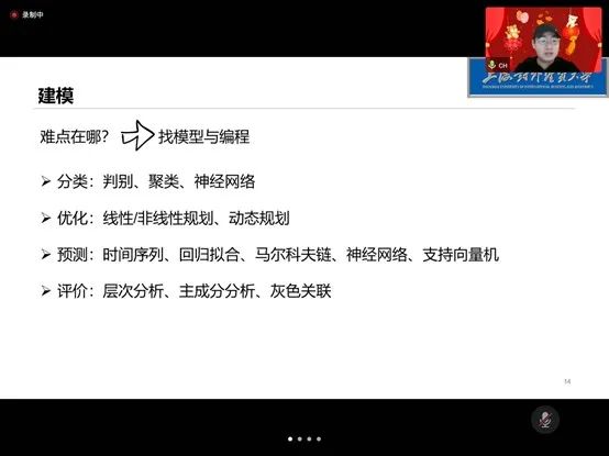 陳皓同學從在組隊方面,賽前準備方面,建模方面分享了自己的經驗。在賽前準備方面,他建議,對于建模小白來說,可以從暑假開始準備。6-8月學習算法并能夠復現,8-9月復現至少兩篇優秀論文。對于有參賽經驗的同學,可以多參加比賽積累經驗進行準備。而建模過程的軟件選擇,不管是R,python,Matlab,都各有優點和缺點,可以根據自己的習慣進行選擇。