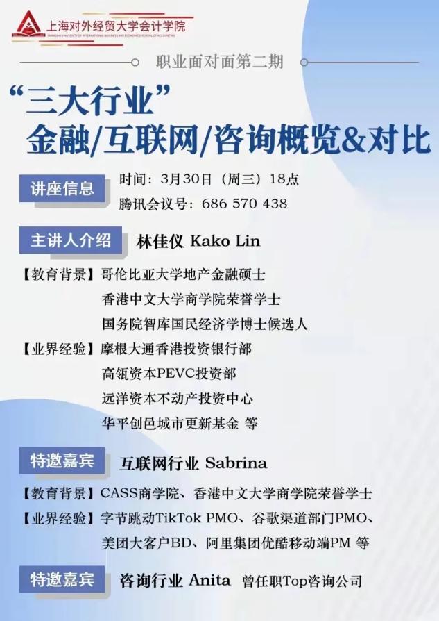為明晰個人職業發展方向,了解當前金融、咨詢、互聯網三大行業情況,幫助同學們解答相關行業的各種疑惑,“會”咖職業生涯發展工作室特別邀請到三位行業中的“大咖”嘉賓,開展線上講座與同學們交流分享她們的業界經驗。
