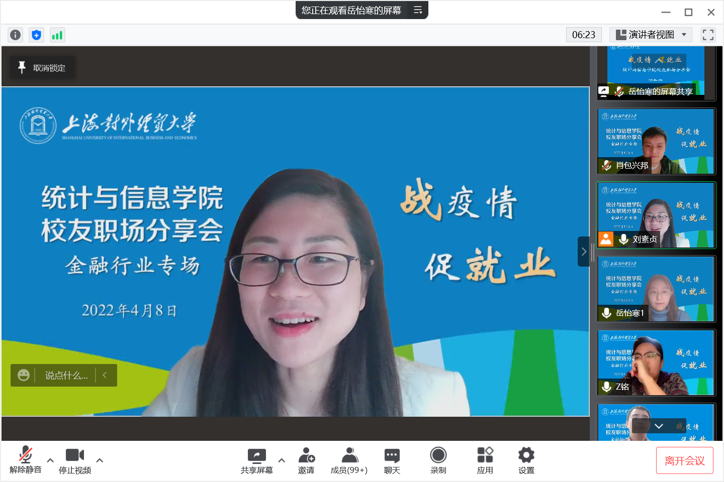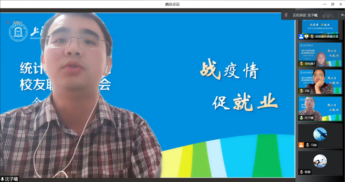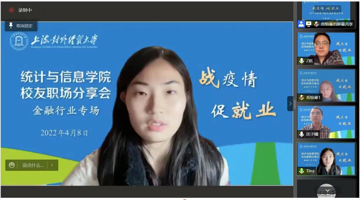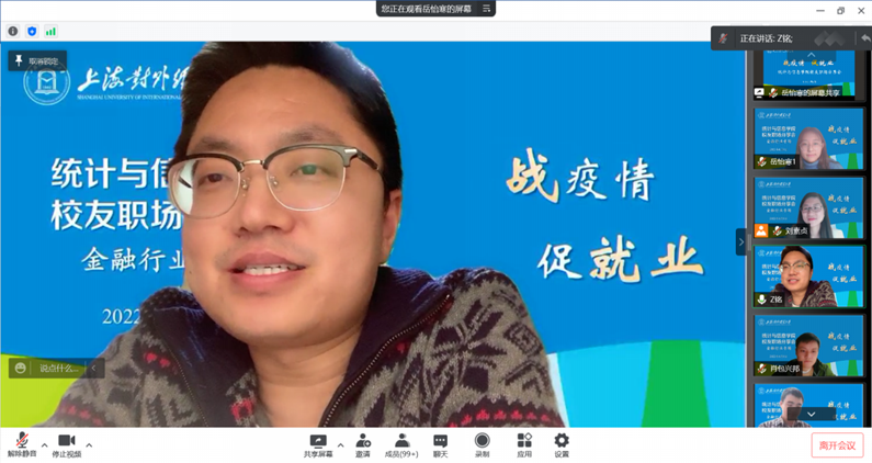 為積極應對當前疫情形勢,充分發揮校友資源優勢,做好學生職業生涯規劃教育和畢業生就業工作,統計與信息學院舉辦校友職場分享會系列活動,4月8日晚首場活動邀請了學院2015屆研究生校友、海通證券股份有限公司固定收益部投資經理沈子曦和財通基金管理有限公司機構業務項目經理張洲銘,為學生在線分享金融行業求職和職場經驗。學院黨委副書記(主持工作)劉素貞,導師代表、教務處副處長王磊,輔導員與近150名學生參加,活動由學院團委副書記、輔導員岳怡寒主持。