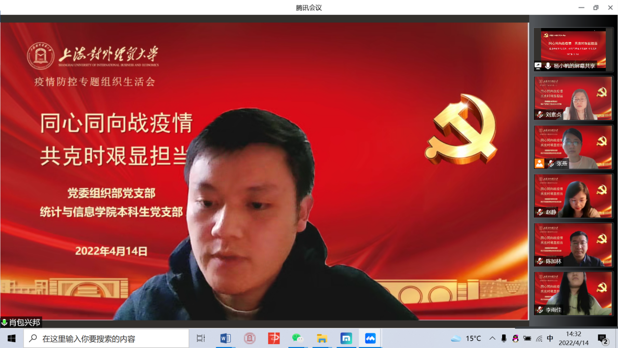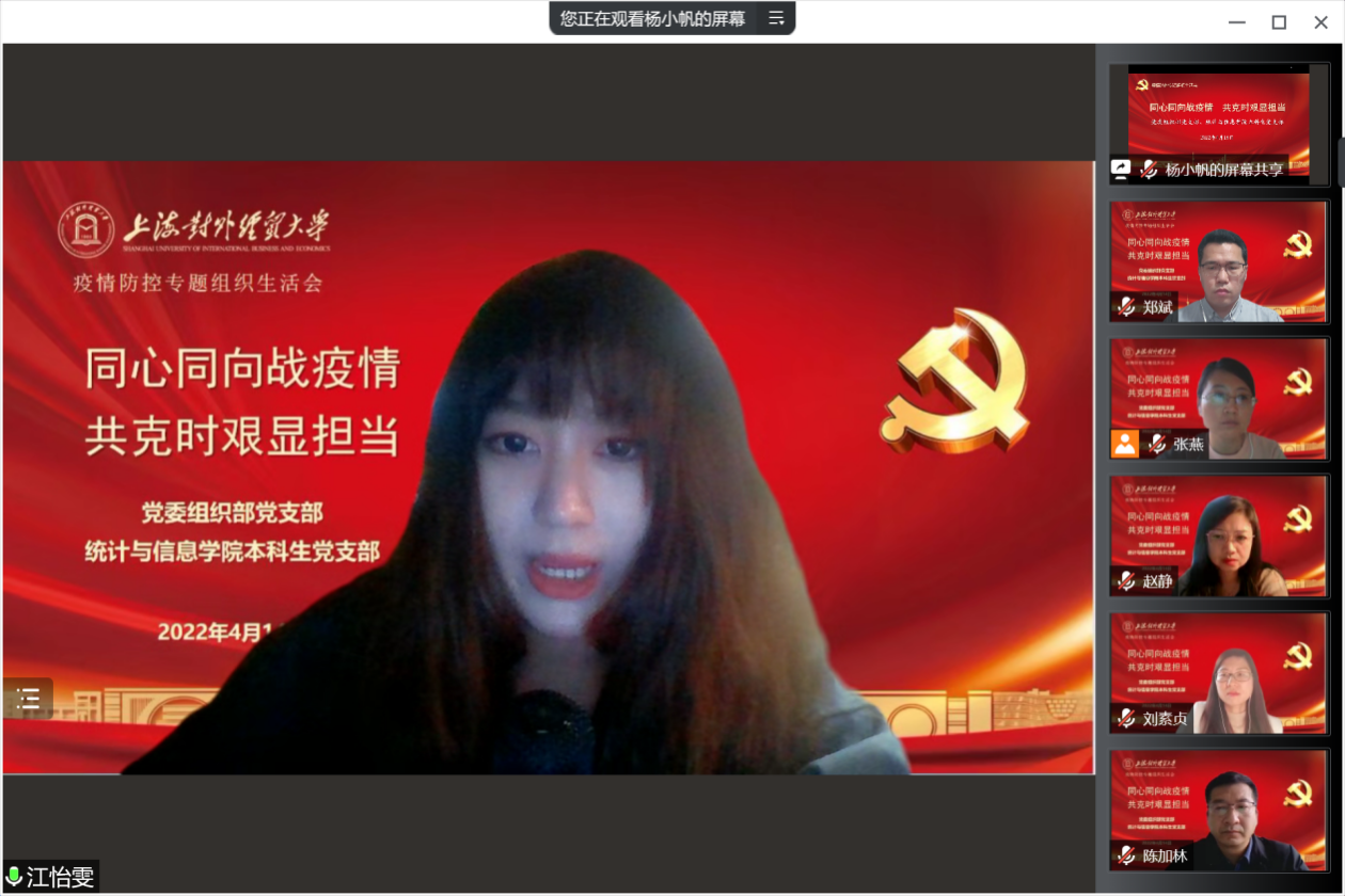 4月14日下午,黨委組織部黨支部和統(tǒng)計(jì)與信息學(xué)院本科生黨支部以“同心同向戰(zhàn)疫情 共克時(shí)艱顯擔(dān)當(dāng)”為主題,聯(lián)組在線召開疫情防控專題組織生活會(huì),校黨委副書記吳毅參加組織生活會(huì)并做專題黨課。會(huì)議由統(tǒng)計(jì)與信息學(xué)院本科生黨支部書記、輔導(dǎo)員楊小帆主持。