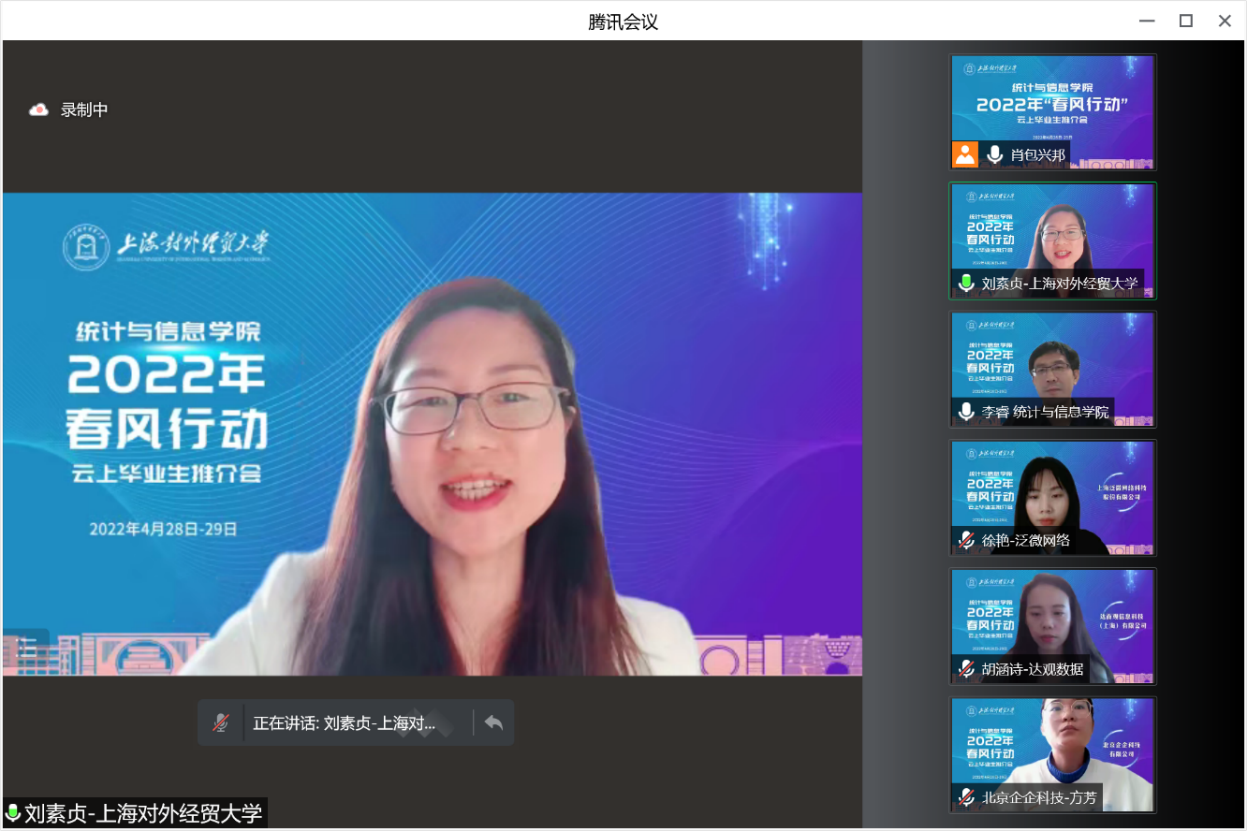 統(tǒng)計與信息學(xué)院黨委副書記(主持工作)劉素貞介紹,“春風(fēng)行動”——云上畢業(yè)生推介會有幾個特點,一是集中推介+滾動招聘,推介會不是一次性的推介活動,而是每周滾動開展,結(jié)合企業(yè)需求,多元化、便捷化、即刻性開展招聘工作;二是精準(zhǔn)投放+量身定制,學(xué)院與企業(yè)前期充分溝通,企業(yè)了解了學(xué)院的辦學(xué)定位、人才培養(yǎng)特色和專業(yè)情況,精準(zhǔn)投放了就業(yè)崗位,為畢業(yè)生量身定制;三是“一人一策”+“一企一案”,學(xué)院和企業(yè)共同搭建推介會平臺,面向?qū)W生做好“一人一策”,針對企業(yè)實行“一企一案”,用人單位、學(xué)院與學(xué)生共同發(fā)力,全方位保障達成就業(yè)意向。