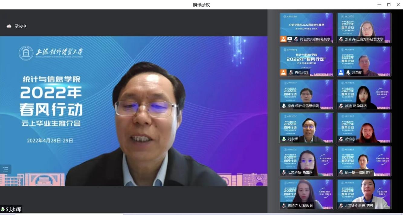統(tǒng)計與信息學(xué)院院長劉永輝表示,學(xué)校領(lǐng)導(dǎo)和學(xué)院班子高度重視畢業(yè)生就業(yè)工作,在當(dāng)前疫情形勢下在線召開畢業(yè)生推介會,是高校與用人單位攜手戰(zhàn)疫、共克時艱的實際行動。學(xué)院通過建立全覆蓋、全過程就業(yè)服務(wù)體系,做精做細做好學(xué)生就業(yè)引導(dǎo)和幫扶,發(fā)揮支部引領(lǐng)和黨員教師的模范帶頭作用,將生涯發(fā)展規(guī)劃和就業(yè)指導(dǎo)貫穿于學(xué)生培養(yǎng)的各個環(huán)節(jié),助力實現(xiàn)畢業(yè)生穩(wěn)就業(yè)、好就業(yè)、早就業(yè)。下一步,學(xué)院領(lǐng)導(dǎo)班子將繼續(xù)帶頭訪企拓崗、包干幫扶,發(fā)揮“三全育人”機制作用,動員一切力量,用好一切資源,想盡一切方法,解決一切困難,切實做好畢業(yè)生就業(yè)工作。