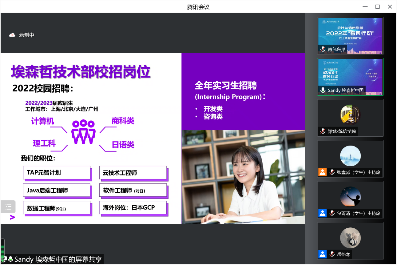 這是上海對外經(jīng)貿(mào)大統(tǒng)計與信息學(xué)院推進實施的“春風(fēng)行動”,為切實促進畢業(yè)生更充分、更高質(zhì)量就業(yè),積極搭建在校畢業(yè)生與用人單位精準(zhǔn)供需對接的平臺,于2022年4月起每周在線舉辦云上畢業(yè)生推介會。首場集中推介會于4月28日和29日兩天滾動舉行,吸引了埃森哲(中國)有限公司、上海投資咨詢集團有限公司、上海泛微網(wǎng)絡(luò)科技有限公司等15家用人單位,提供近60個就業(yè)崗位。25人初步達成了就業(yè)意向,約占招聘崗位的二分之一。