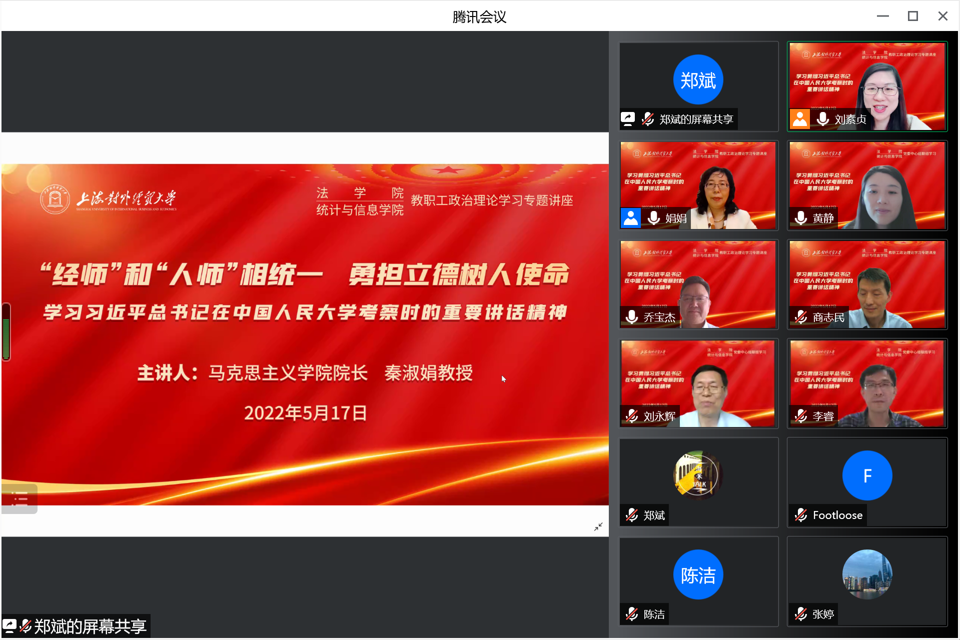 5月17日下午,法學(xué)院、統(tǒng)計與信息學(xué)院在線舉行聯(lián)組學(xué)習(xí),專題學(xué)習(xí)習(xí)近平總書記在中國人民大學(xué)考察時的重要講話精神,馬克思主義學(xué)院院長秦淑娟教授受邀做專題輔導(dǎo)報告,法學(xué)院黨委書記黃靜、院長喬寶杰,統(tǒng)計與信息學(xué)院院長劉永輝、黨委副書記(主持工作)劉素貞,以及兩個學(xué)院領(lǐng)導(dǎo)班子成員、全體教職工共同參加學(xué)習(xí)。會議由劉素貞主持。