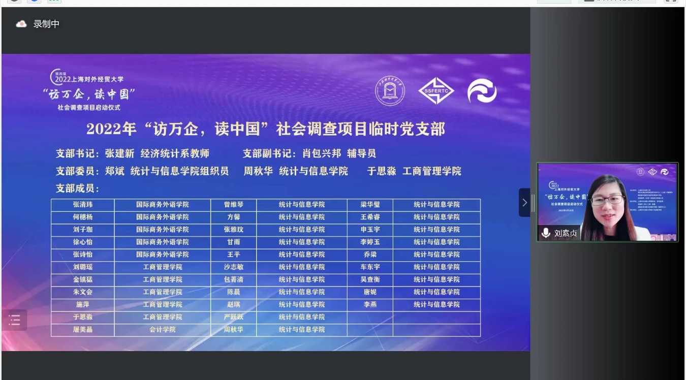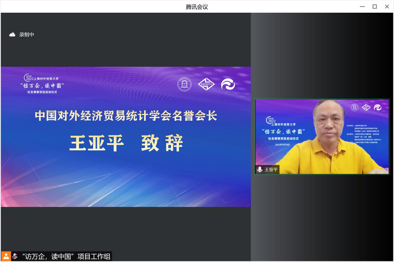5月28日下午,第四屆“訪萬企,讀中國”社會調查項目啟動儀式在線舉行,中國對外經濟貿易統計學會名譽會長王亞平,環球慧思(北京)信息技術有限公司董事長邵宏華,上海對外經貿大學校長汪榮明,副校長徐永林,學校辦公室、黨委組織部、黨委宣傳部、教務處、研究生院、科研處、黨委學(研)工部、團委、國際經貿創新與治理研究院等相關部門負責人,來自全校各學院的調查項目指導教師、學生隊員共同出席啟動儀式。啟動儀式由統計與信息學院黨委副書記(主持工作)劉素貞主持。