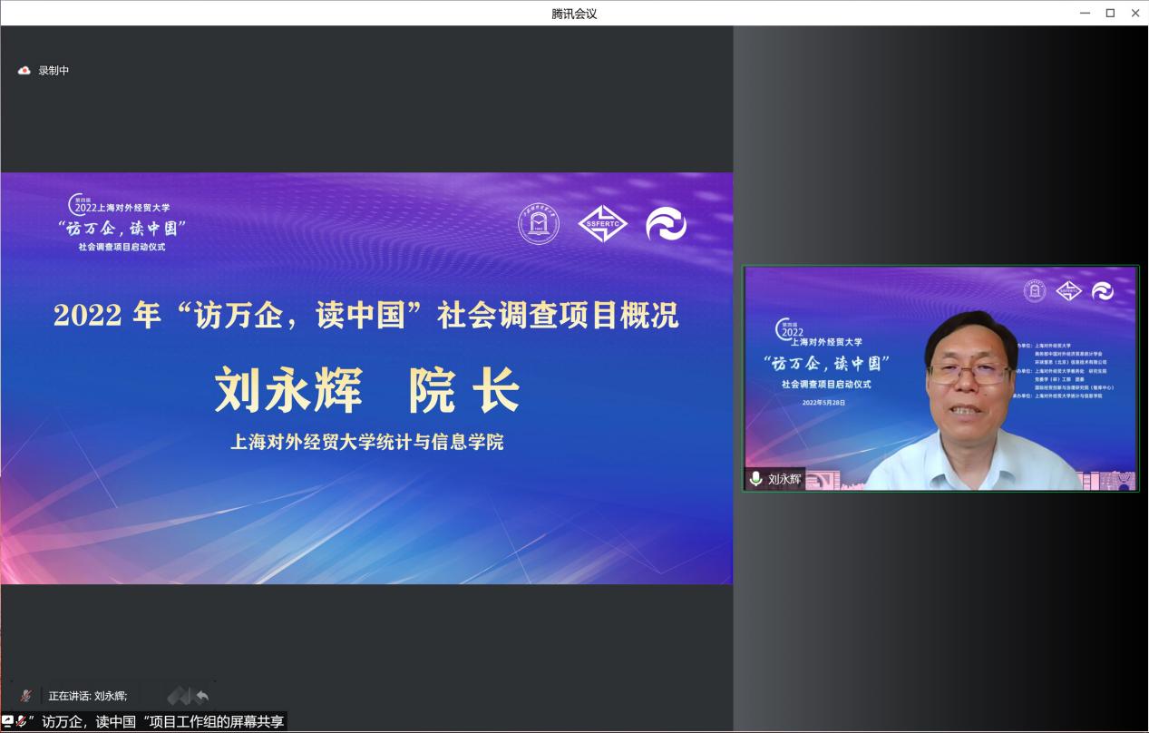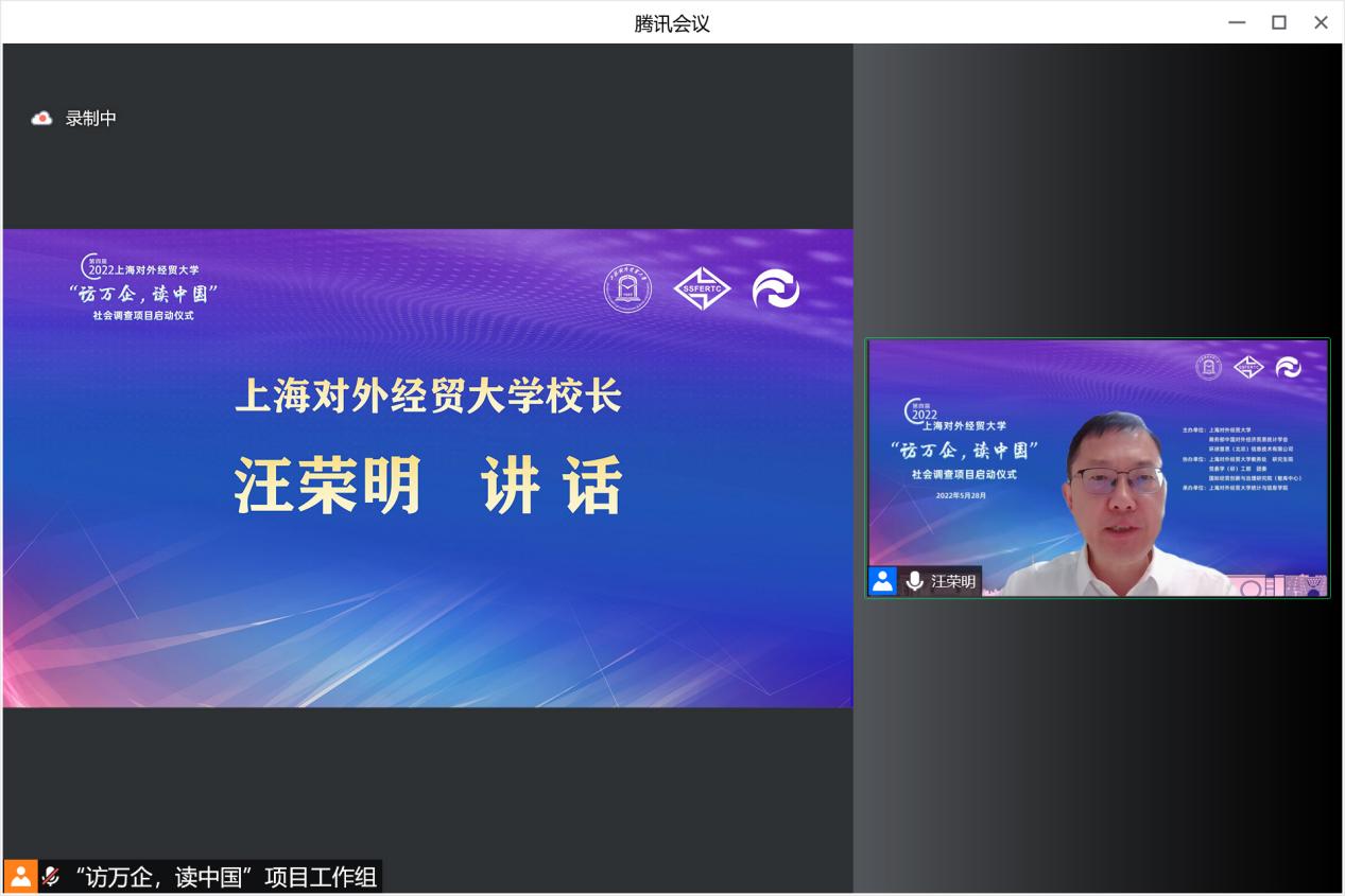 會上播放了本次“訪萬企,讀中國”社會調查項目啟動短視頻。 “訪萬企,讀中國”社會調查項目于2019年由上海對外經貿大學發起,由上海對外經貿大學、中國對外經濟貿易統計學會和環球慧思(北京)信息技術有限公司等單位共同組織實施,上海對外經貿大學統計與信息學院承辦,連續三年分別圍繞“優化營商環境,助推外貿企業轉型升級”“新冠肺炎疫情下外貿企業的數字化轉型”“聚焦貿易數字化,助力長三角一體化高質量發展”主題,累計近900名師生深度走訪和調查了近800家企業,開展接力跟蹤式調查研究,形成了近百份調查報告,助推企業轉型發展,服務貿易強國建設,為上海和國家相關部門提供決策參考,獲新華社、人民網、光明日報等十余家媒體宣傳報道,產生了廣泛的社會影響。
