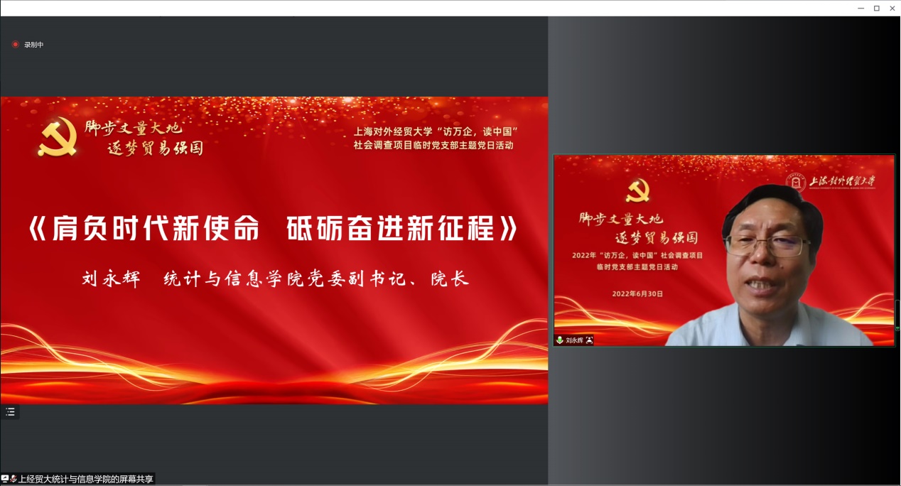 為迎接黨的二十大勝利召開,深入學(xué)習(xí)貫徹上海市第十二次黨代會精神,在建黨101周年來臨之際,6月30日下午,上海對外經(jīng)貿(mào)大學(xué)2022年“訪萬企,讀中國”社會調(diào)查項目臨時黨支部在線開展主題黨日活動,以“腳步丈量大地 逐夢貿(mào)易強國”為主題邀請校內(nèi)外專家開設(shè)專題黨課,激勵參與調(diào)查項目的師生牢記囑托、砥礪奮進(jìn),以黨建領(lǐng)航助推“訪萬企,讀中國”社會調(diào)查項目取得高質(zhì)量成果。