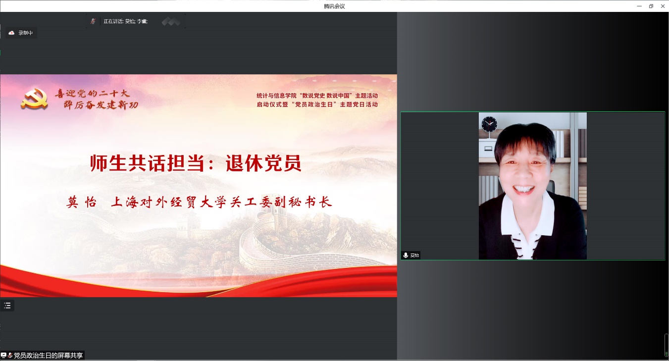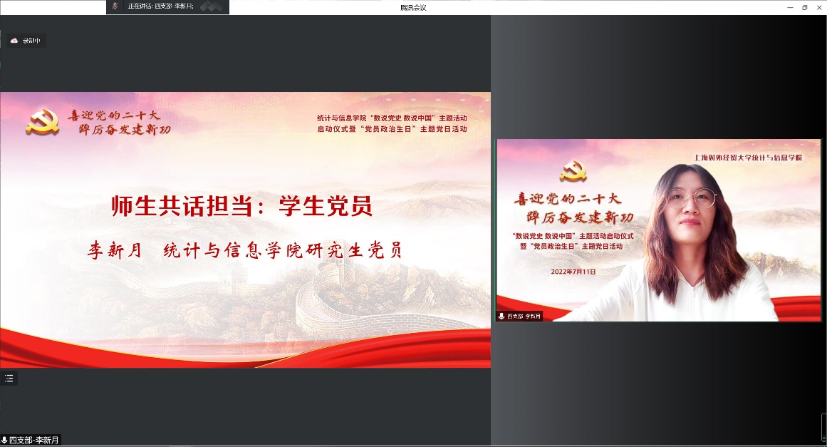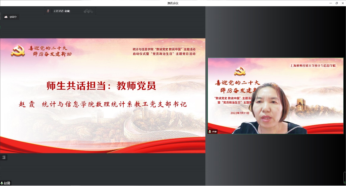 為迎接黨的二十大勝利召開(kāi),深入學(xué)習(xí)貫徹落實(shí)上海市第十二次黨代會(huì)精神,推動(dòng)黨史學(xué)習(xí)教育常態(tài)化長(zhǎng)效化,統(tǒng)計(jì)與信息學(xué)院以“喜迎黨的二十大 踔厲奮發(fā)建新功”為主題,于7月11日下午,在線舉辦“數(shù)說(shuō)黨史 數(shù)說(shuō)中國(guó)”主題活動(dòng)啟動(dòng)儀式暨“黨員政治生日”主題黨日活動(dòng)。校黨委副書記吳毅出席活動(dòng)并致辭,上海市第十二次黨代會(huì)代表、中共四大紀(jì)念館黨支部副書記、宣教部主任丁曉,校黨委組織部副部長(zhǎng)趙靜,校關(guān)工委副秘書長(zhǎng)莫怡,統(tǒng)計(jì)與信息學(xué)院黨委領(lǐng)導(dǎo)班子、全體黨員師生和入黨積極分子近300人共同參加。活動(dòng)由統(tǒng)計(jì)與信息學(xué)院黨委副書記李睿主持。