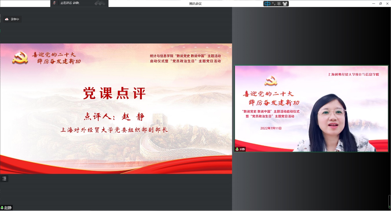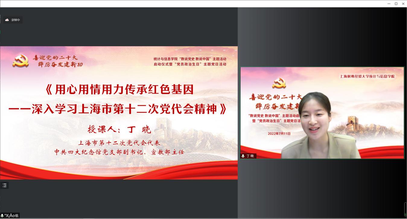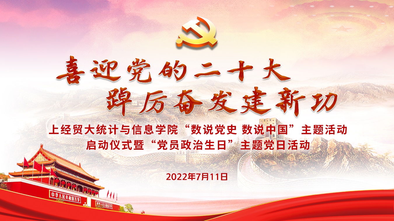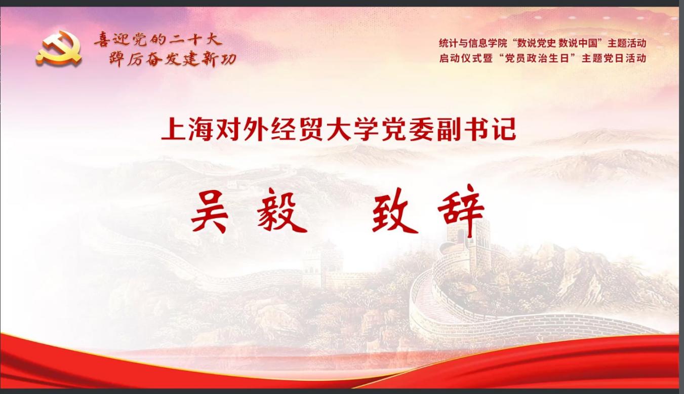 為迎接黨的二十大勝利召開(kāi),深入學(xué)習(xí)貫徹落實(shí)上海市第十二次黨代會(huì)精神,推動(dòng)黨史學(xué)習(xí)教育常態(tài)化長(zhǎng)效化,統(tǒng)計(jì)與信息學(xué)院以“喜迎黨的二十大 踔厲奮發(fā)建新功”為主題,于7月11日下午,在線舉辦“數(shù)說(shuō)黨史 數(shù)說(shuō)中國(guó)”主題活動(dòng)啟動(dòng)儀式暨“黨員政治生日”主題黨日活動(dòng)。校黨委副書(shū)記吳毅出席活動(dòng)并致辭,上海市第十二次黨代會(huì)代表、中共四大紀(jì)念館黨支部副書(shū)記、宣教部主任丁曉,校黨委組織部副部長(zhǎng)趙靜,校關(guān)工委副秘書(shū)長(zhǎng)莫怡,統(tǒng)計(jì)與信息學(xué)院黨委領(lǐng)導(dǎo)班子、全體黨員師生和入黨積極分子近300人共同參加。活動(dòng)由統(tǒng)計(jì)與信息學(xué)院黨委副書(shū)記李睿主持。
