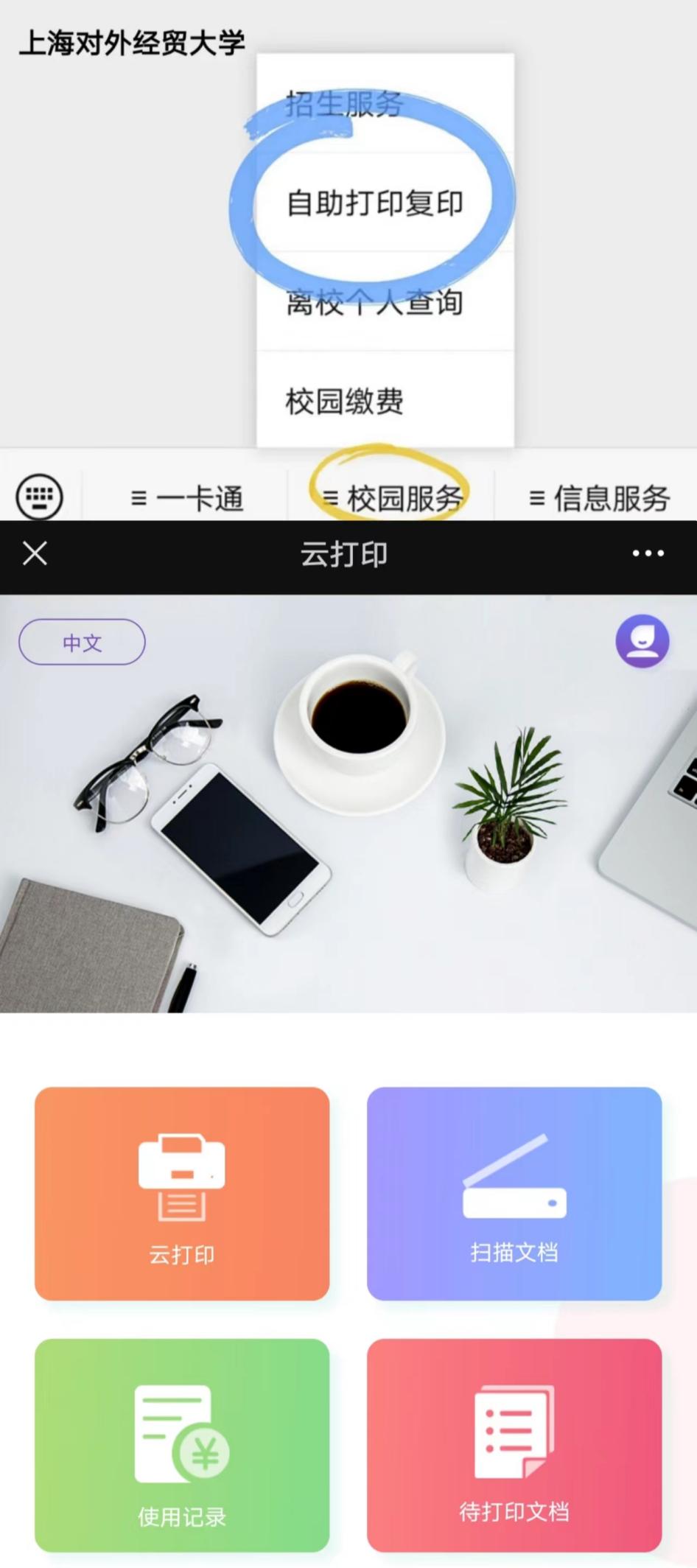 2)點擊對話框里的“校園服務”,再點擊“自助打印復印”